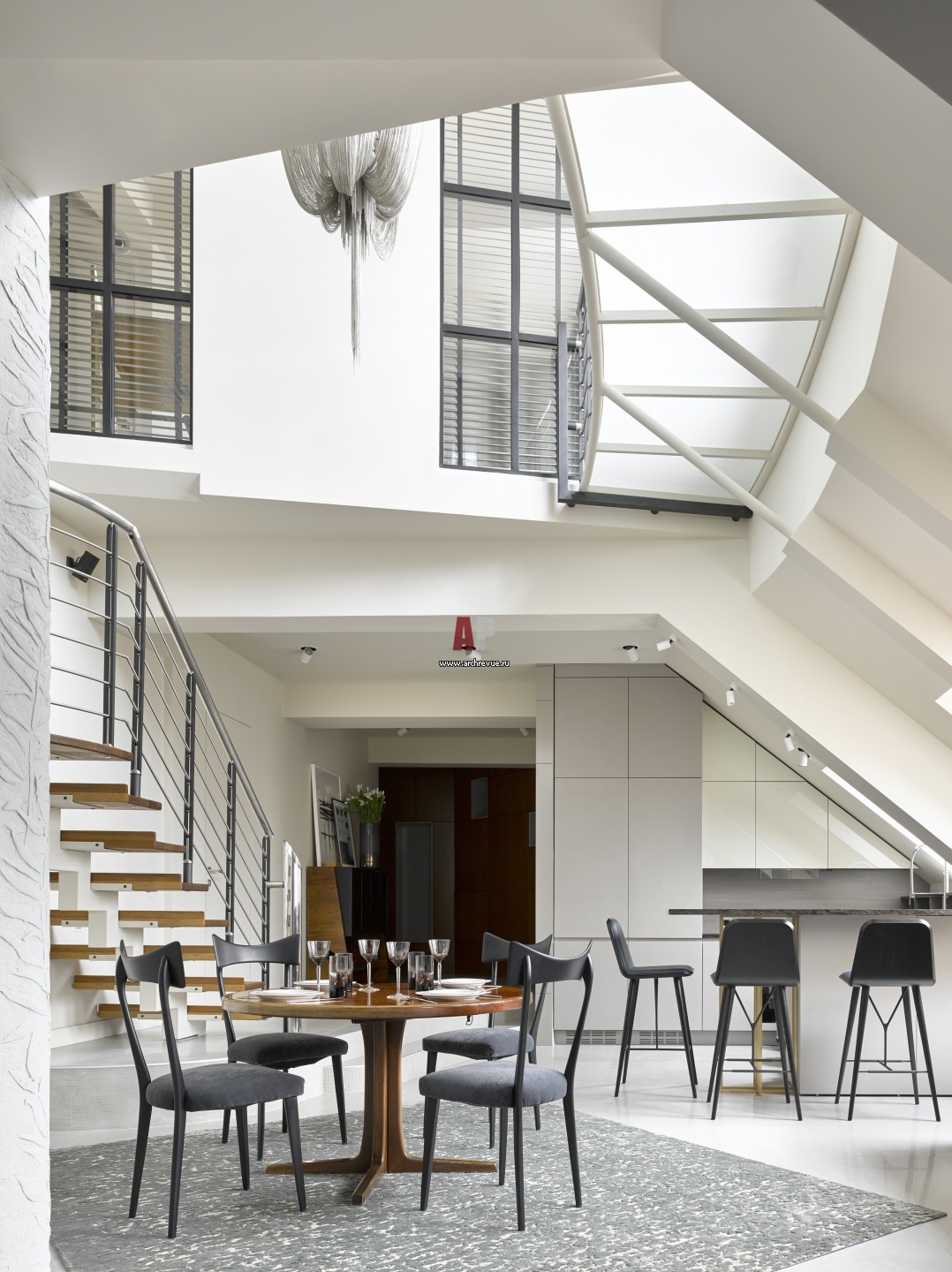 Двухсветное пространство гостиной с обеденной группой. Окна приватных помещений второго этажа обращены на общее внутреннее пространство. Раньше вместо панорамных окон были брутальные офисные перегородки и со стеклоблоками. Теперь – инновационные витражи из стали и стекла с хорошей звукоизоляцией. Со стороны жилых помещений они закрываются жалюзи.