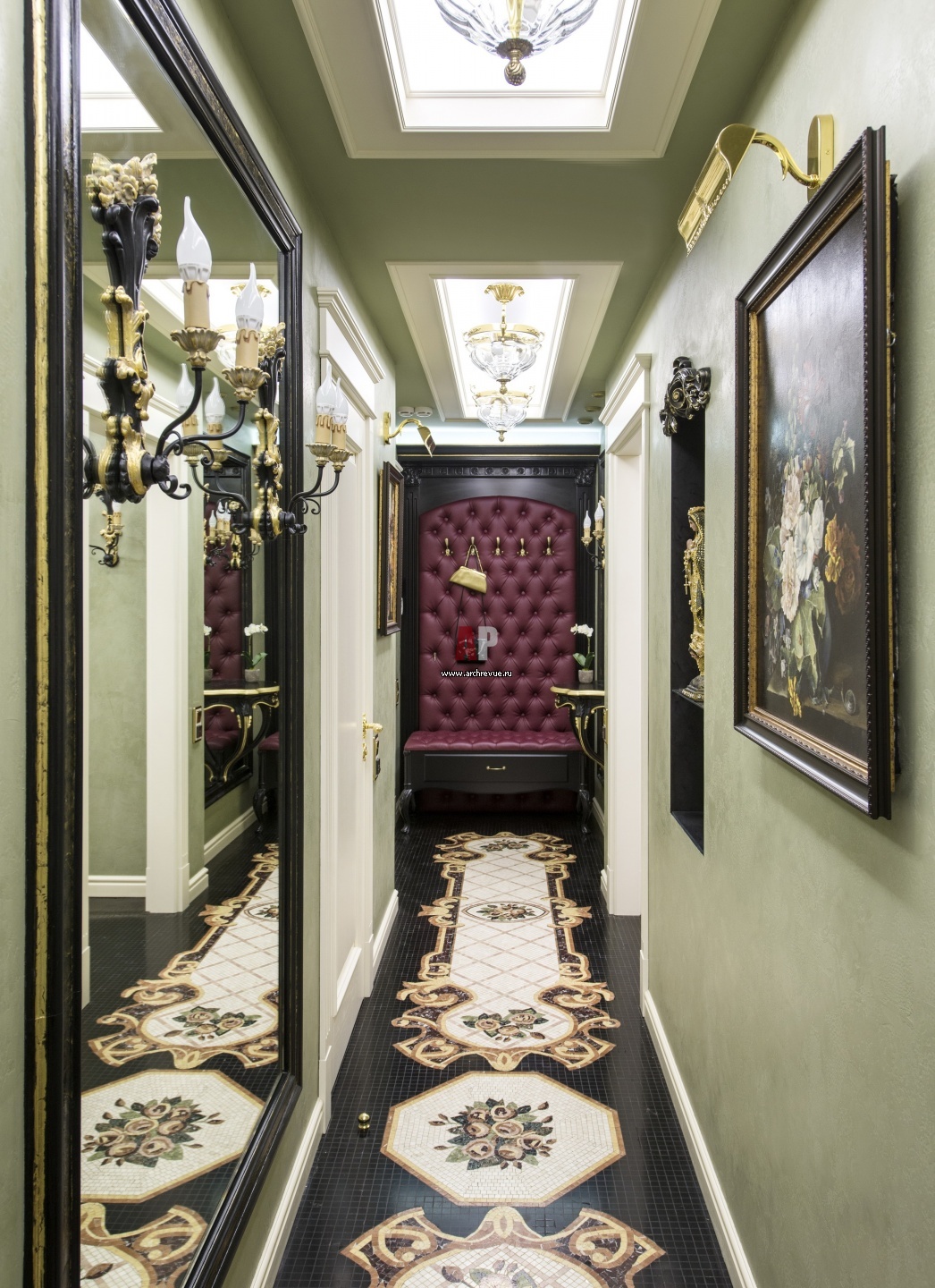 Стилистику прихожей и коридора задала скульптура Девы Гваделупской, привезенная заказчиками из путешествия. Оформление стен декоративной штукатуркой светло-зеленого оттенка (одного из любимых цветов хозяйки дома) контрастирует с напольным панно из черной мозаики с цветочным орнаментом. Декоративная стена за банкеткой скрывает доступ к инженерным коммуникациям.