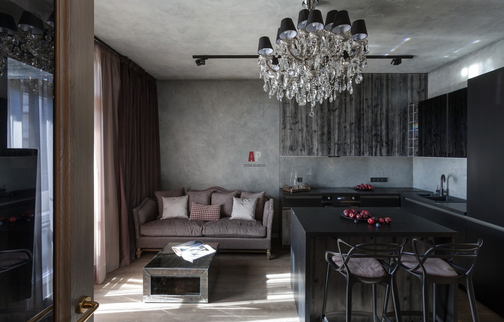 Интерьер кухни-гостиной в квартире-гарсоньерке. Стены и потолки оформлены многослойными декоративными финишами с фактурой бетона. Кухонный гарнитур сделан на заказ, его фасады выполнен из брашированного дерева с состаренной текстурой и тонированного стекла.