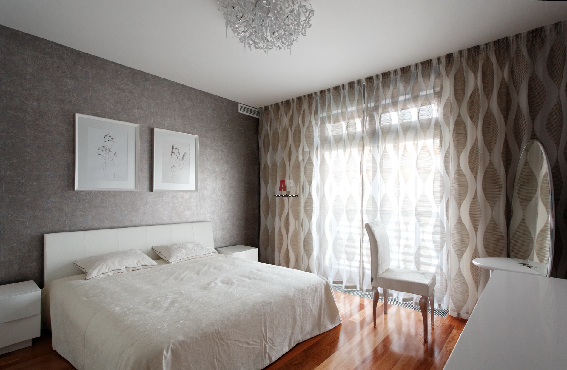 Выдержанная в серебристых тонах спальня выглядит романтично. Над изголовьем кровати – графичные работы художника Рустама Хамдамова.