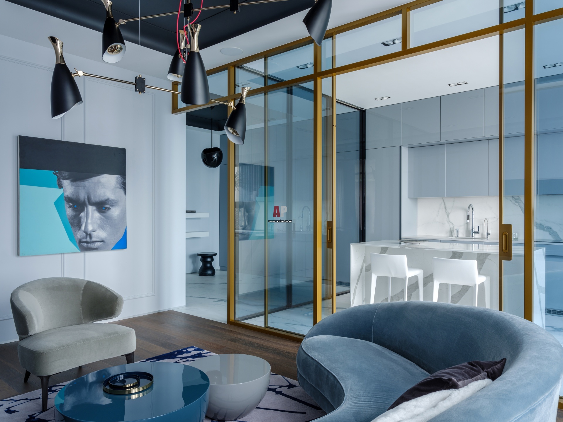 Прозрачная квартира с продуманной эргономикой. Интерьер общей зоны. Благодаря фрамугам с дробным членением перегородка между гостиной и кухней играет роль не только ограждающей конструкции, но и яркого декоративного элемента. Картина В. Баринова «Ален Делон», галерея ArtBrut Moscow.