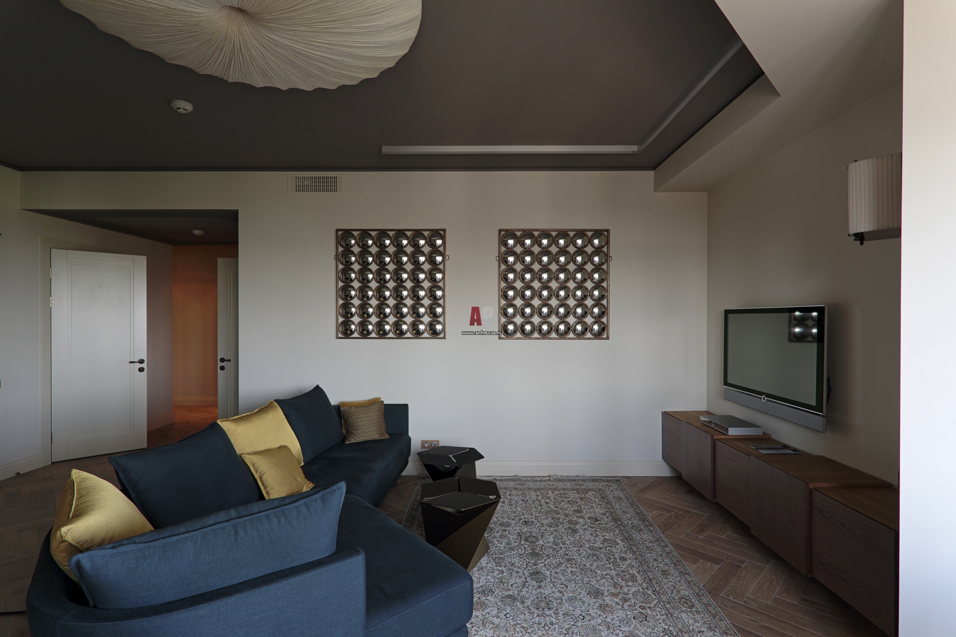 Интерьер эклектичной гостиной. Мягкая зона с ТВ. Чтобы зрительно увеличить площадь и высоту гостиной, авторы выкрасили весь объем помещения (включая потолки) теплой матовой краской оттенка off white. Синий с золотистыми подушками диван повторяет сложную геометрию помещения. Навесная тумба под ТВ из шпона дуба сделана на заказ из нескольких «кубиков» с по-разному ориентированными древесными волокнами.
