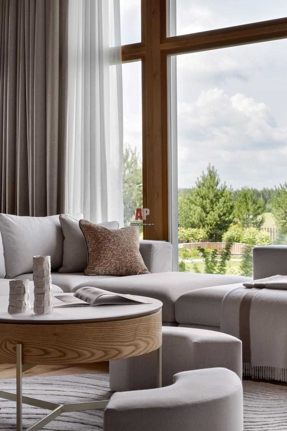 Дом в заповедной зоне Подмосковья для трех поколений семьи. Интерьер гостиной с панорамными окнами и видом на поля гольф-клуба.