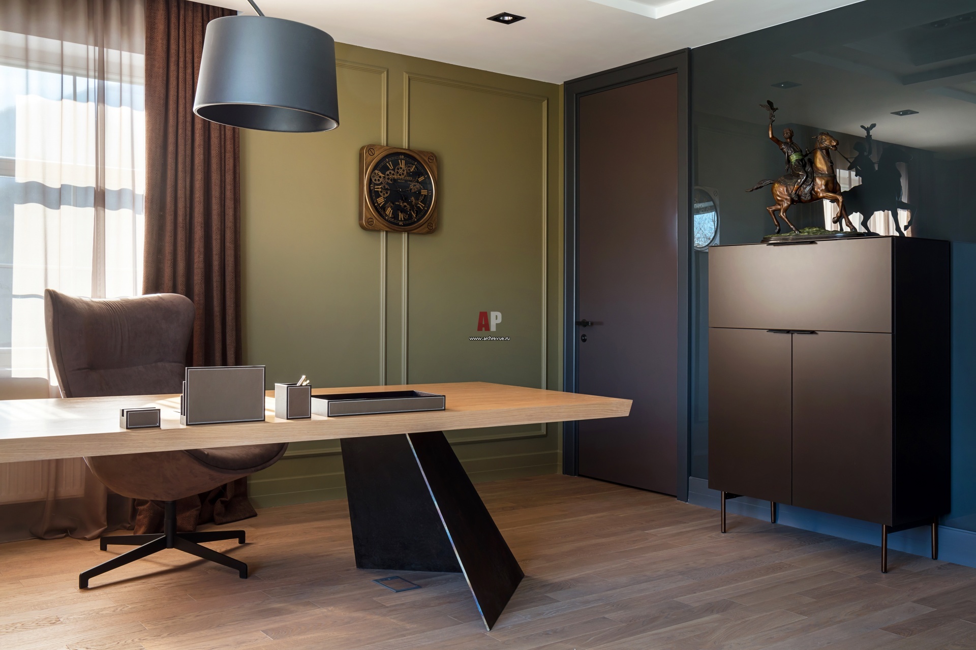 Рабочая зона в кабинете. Стол сделан на заказ, столешница – шпон ясеня, основание – черный металл. Светильник, Foscarini. Комод, Pianca, модель Spazio.
