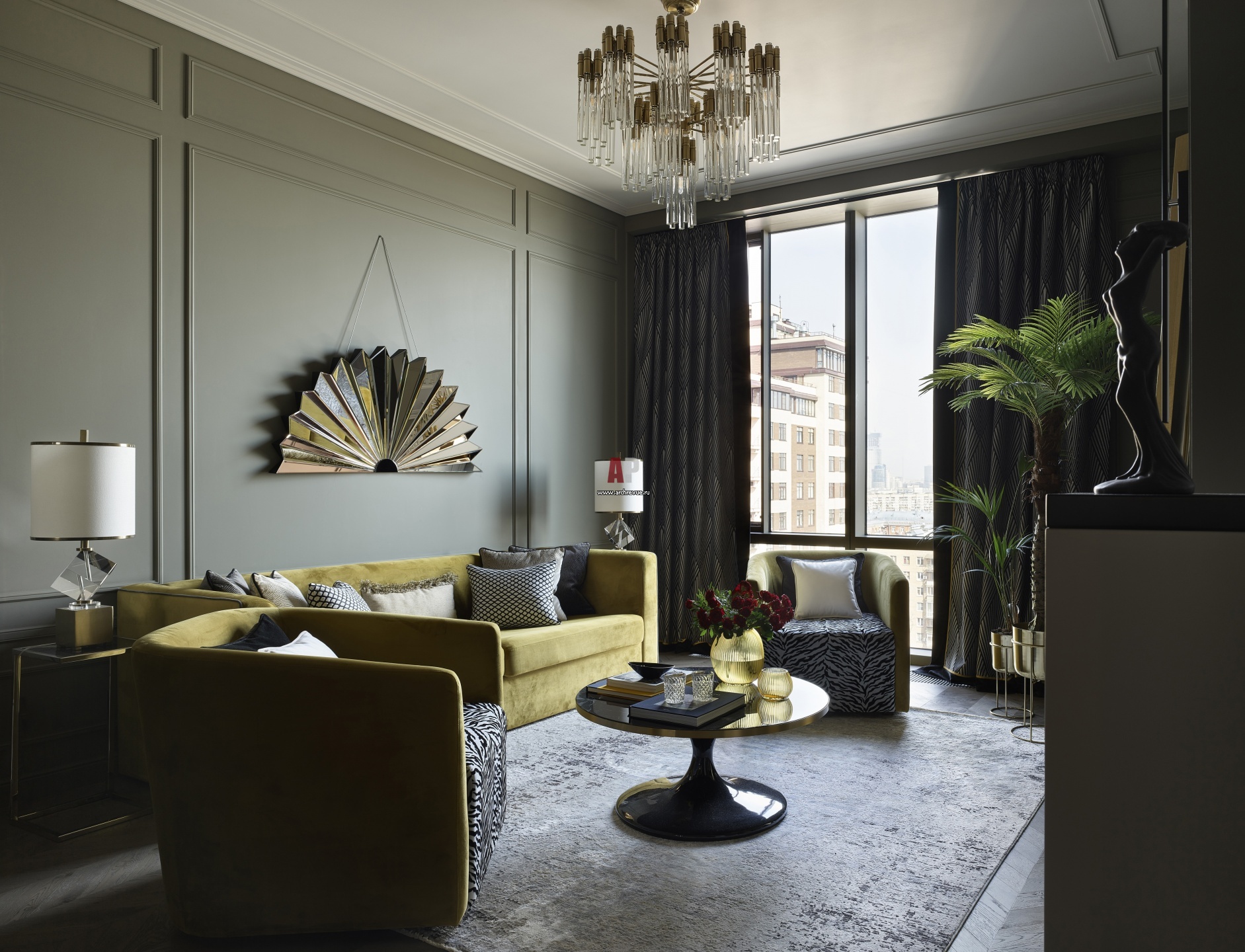 Квартира в стиле ар-деко. Стены гостиной выкрашены в сложный серо-зеленый цвет из палитры красок Little Greene. Диван и кресла сделаны на заказ, по эскизам дизайнера. Люстра, кофейный столик, приставные столики, Eichholtz. Настольные лампы, Uttermost. Изделия из дерева - изготовление Bionica Wood.