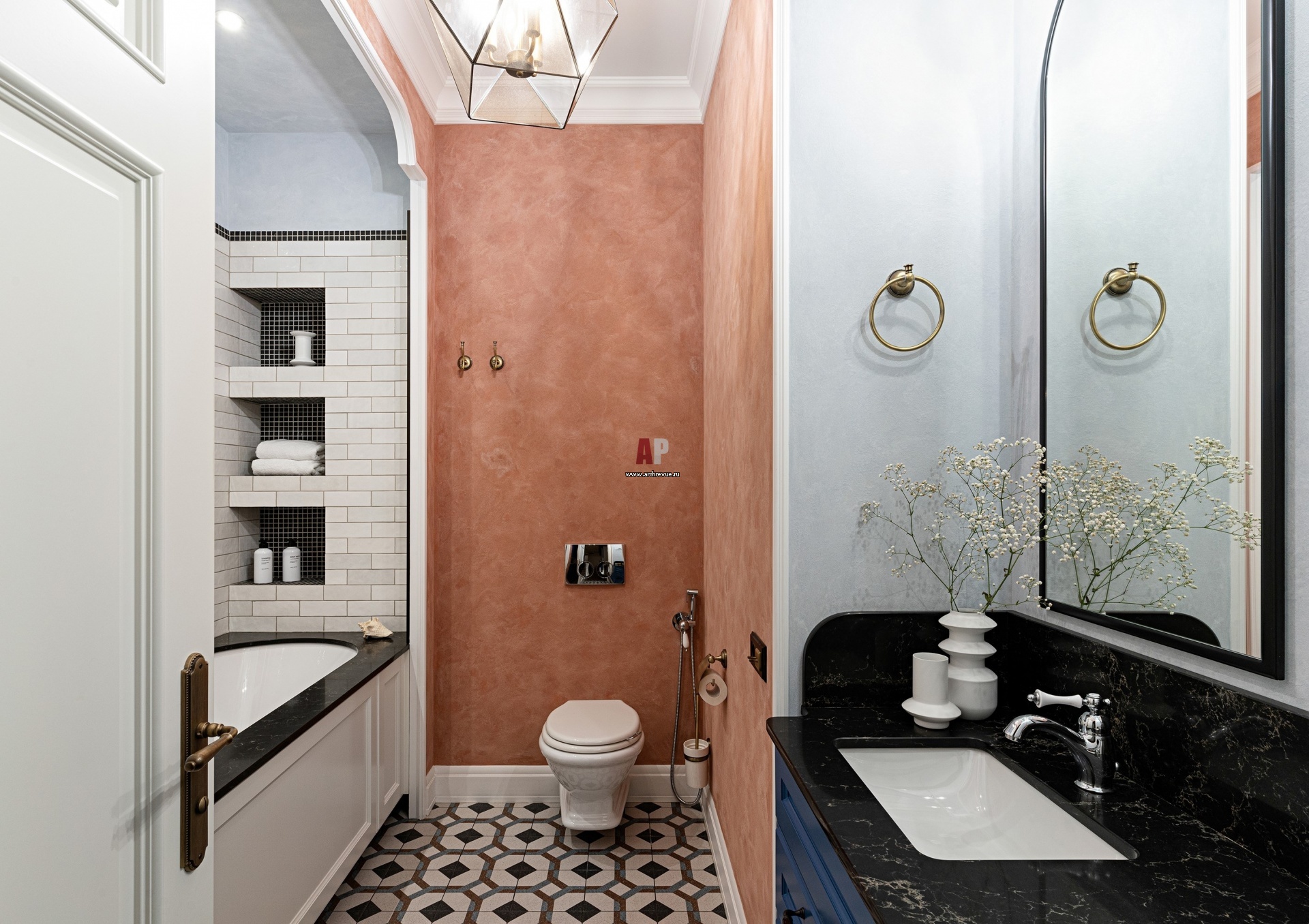 Детский санузел. На стенах – декоративная штукатурка поливелюр с «мягкой» фактурой. В мокрой зоне использована плитка Equipe Ceramicas с эффектом кракелюра. На ванной – топ из натурального камня. Из него же выполнена столешница умывальника. Нижняя часть ванны оформлена съемными МДФ-панелями в эмали для обеспечения беспрепятственного доступа к коммуникациям. Свет, Favourite, Lightstar, Arte Lamp.