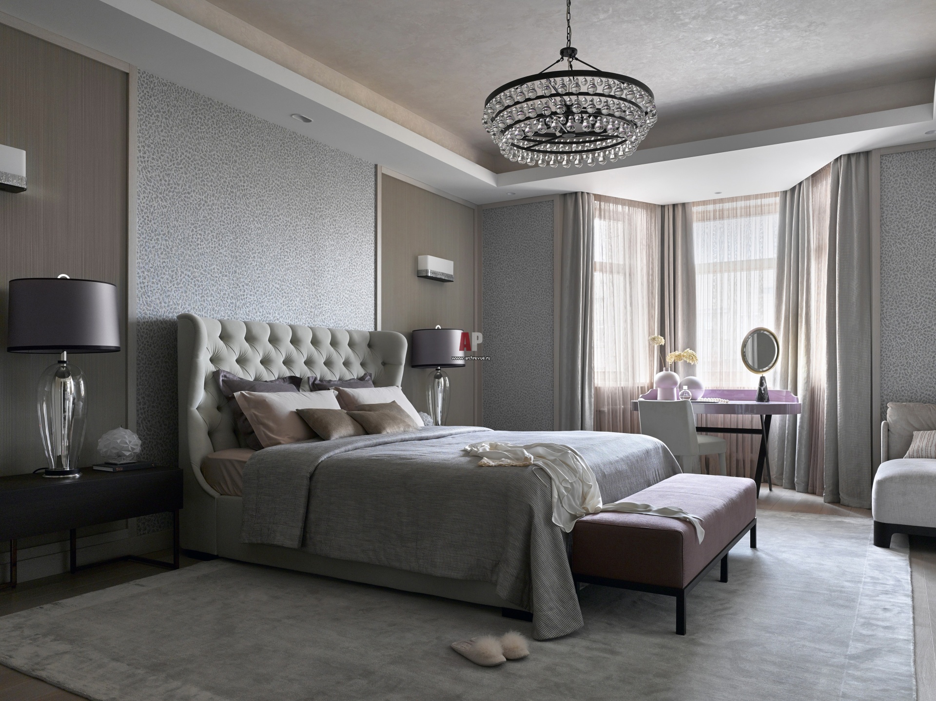 Хозяйская спальня оформлена в благородных серых тонах. Стены декорированы текстурными обоями. Кровать, туалетный столик, стул, диван, лежанка, банкетка, Meridiani. Тумбочки, Pianca. Люстра, Robert Abbey.