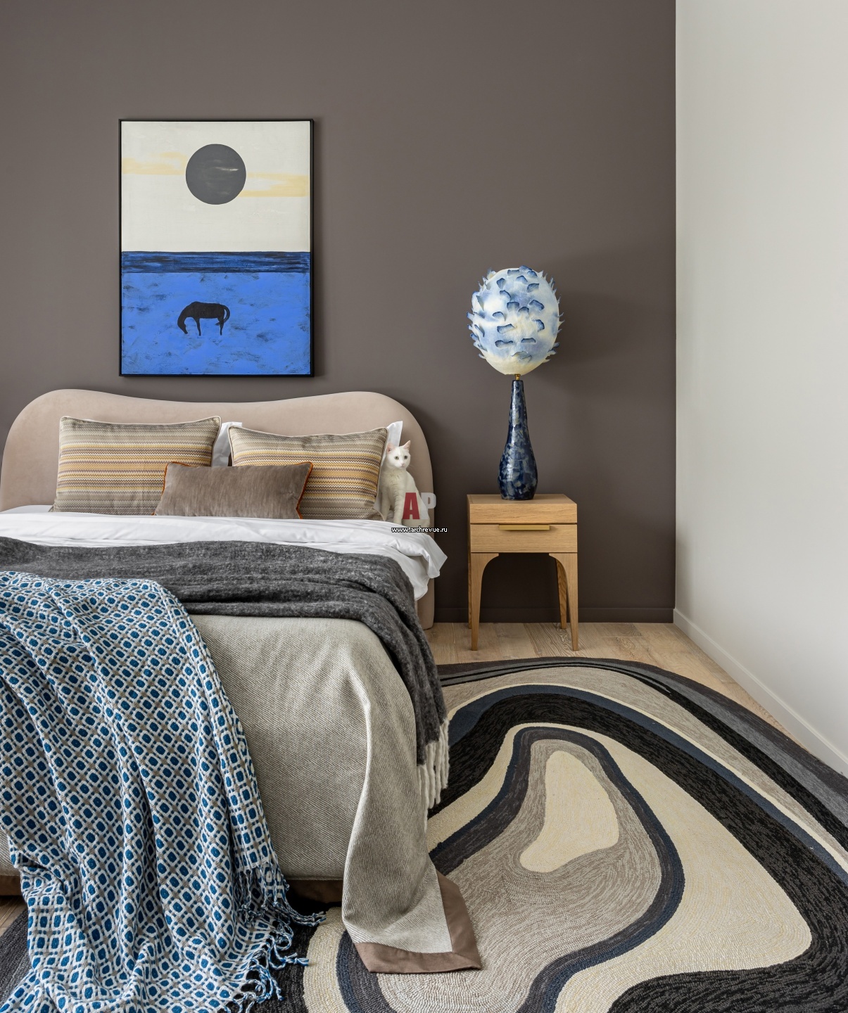Спальня. Декоративные акценты – шерстяной торшер в форме артишока и мягкий ковер-«лужа».