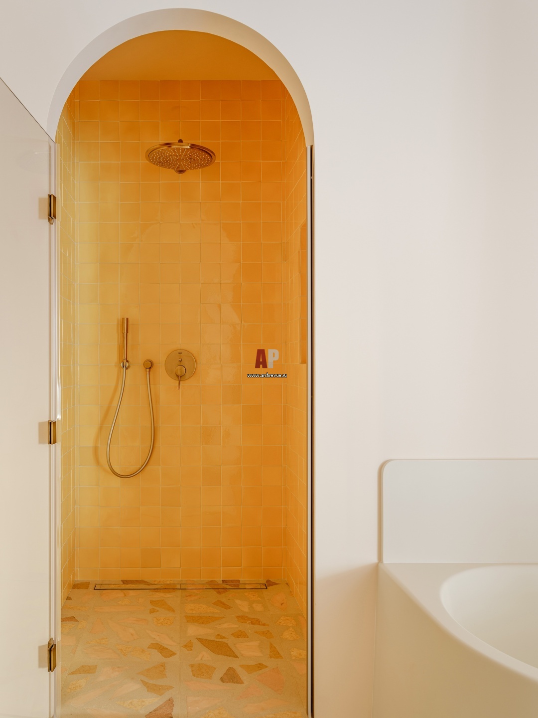 Ванная при кабинете. Марокканское настроение в ней создает техника террацо. Остатки всех розовых камней дизайнер собирала по всей Москве и Петербургу. Ей важно было, чтоб это был не один разломанный слэб, а масса уникальных кусочков из разных пород мрамора, но при этом все розовые.