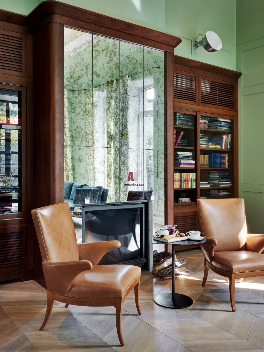 Зона библиотеки с камином. Пол, дубовый паркет. Книжные шкафы и камин, по дизайну Олега Клодта. Консоль, винтаж, Fritz & Hollander, США, 1950-е годы. Кресла, Rose Tarlow.