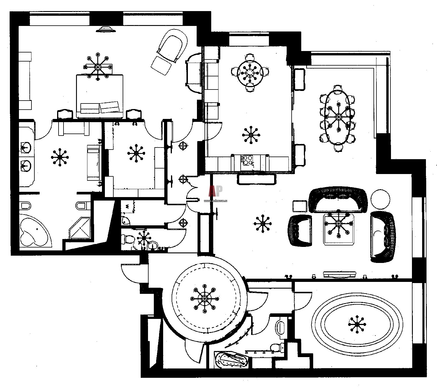 Планировка элитной 3-х комнатной квартиры с круглой прихожей.