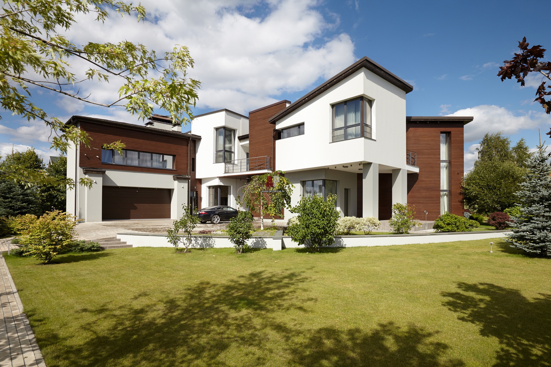 Архитектура дома подчеркнуто современная. Фасады отделаны светлой штукатуркой и акцентированы панелями из термодревесины.