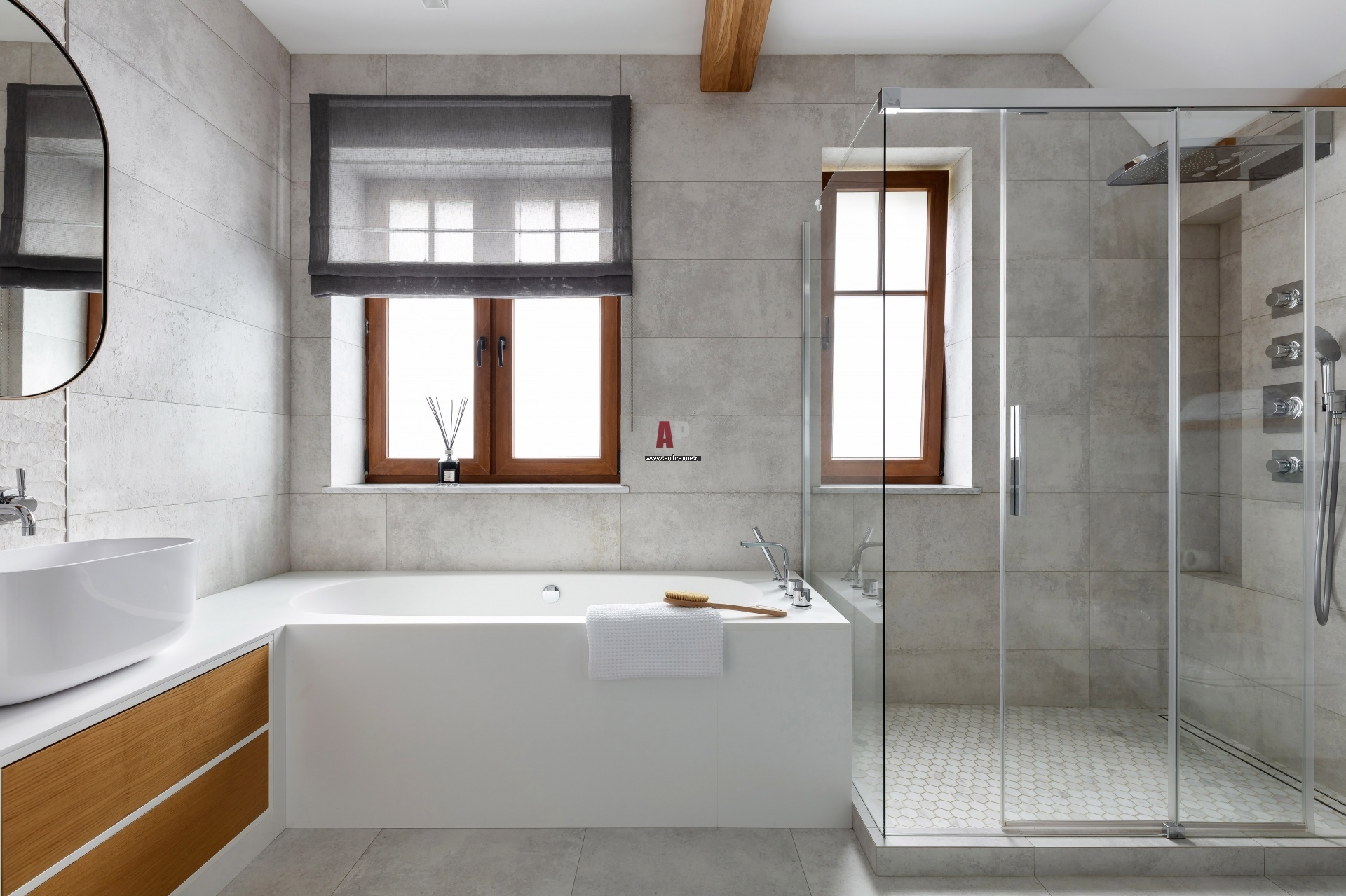 В ванной комнате при главной спальне целых два окна. Единая поверхность столешницы объединяет две раковины и поверхность ванны, создавая цельный объем.