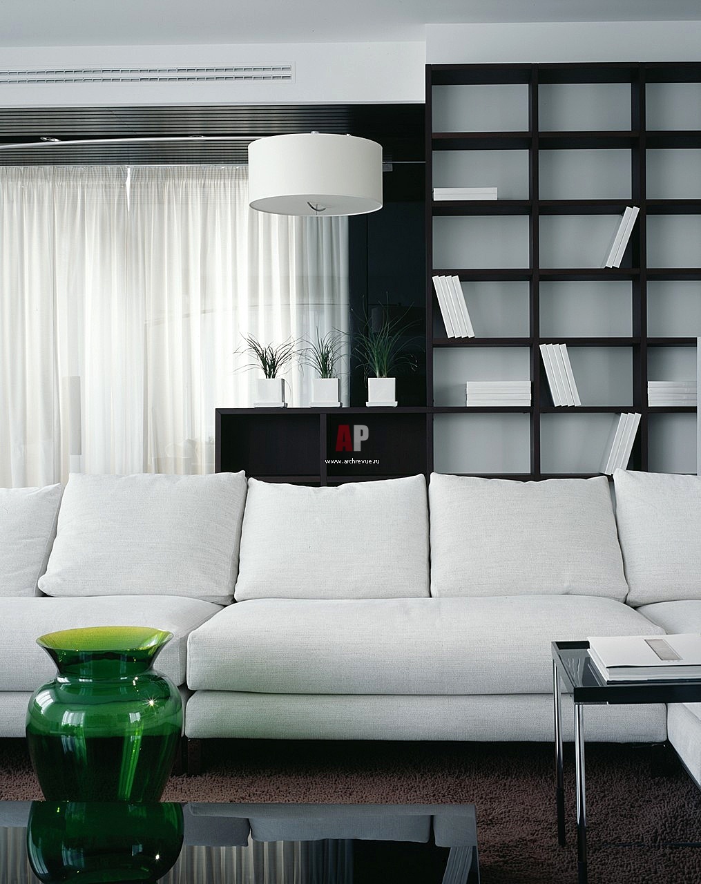 Диванная группа в гостиной. Со светлым диваном контрастирует темный книжный стеллаж.