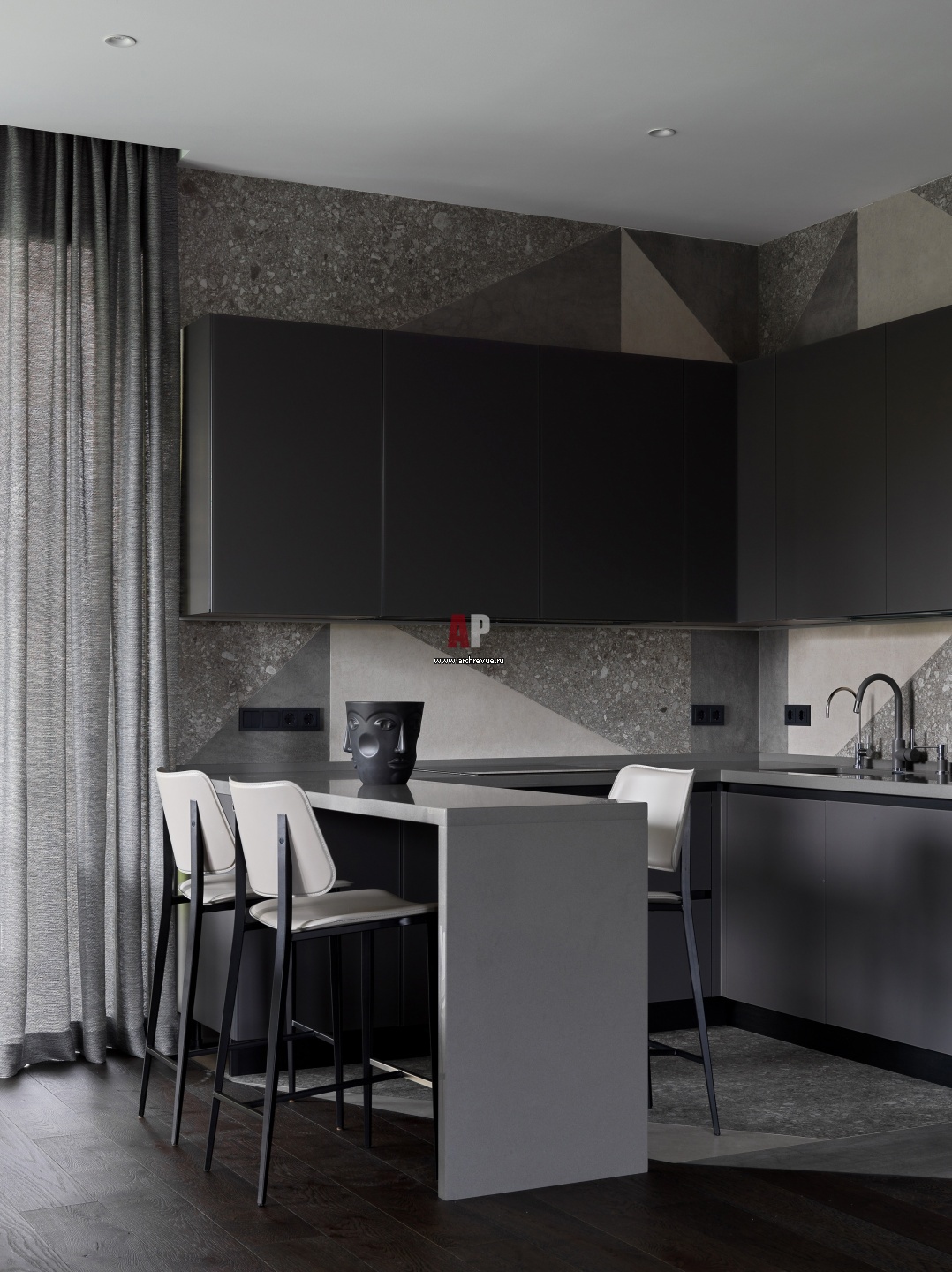 Зона кухни выполнена в темной палитре. Кухонный фартук с геометричным рисунком выложен камнем нескольких сближенных оттенков. Кухонный гарнитур с барной стойкой, Stosa Cucine.