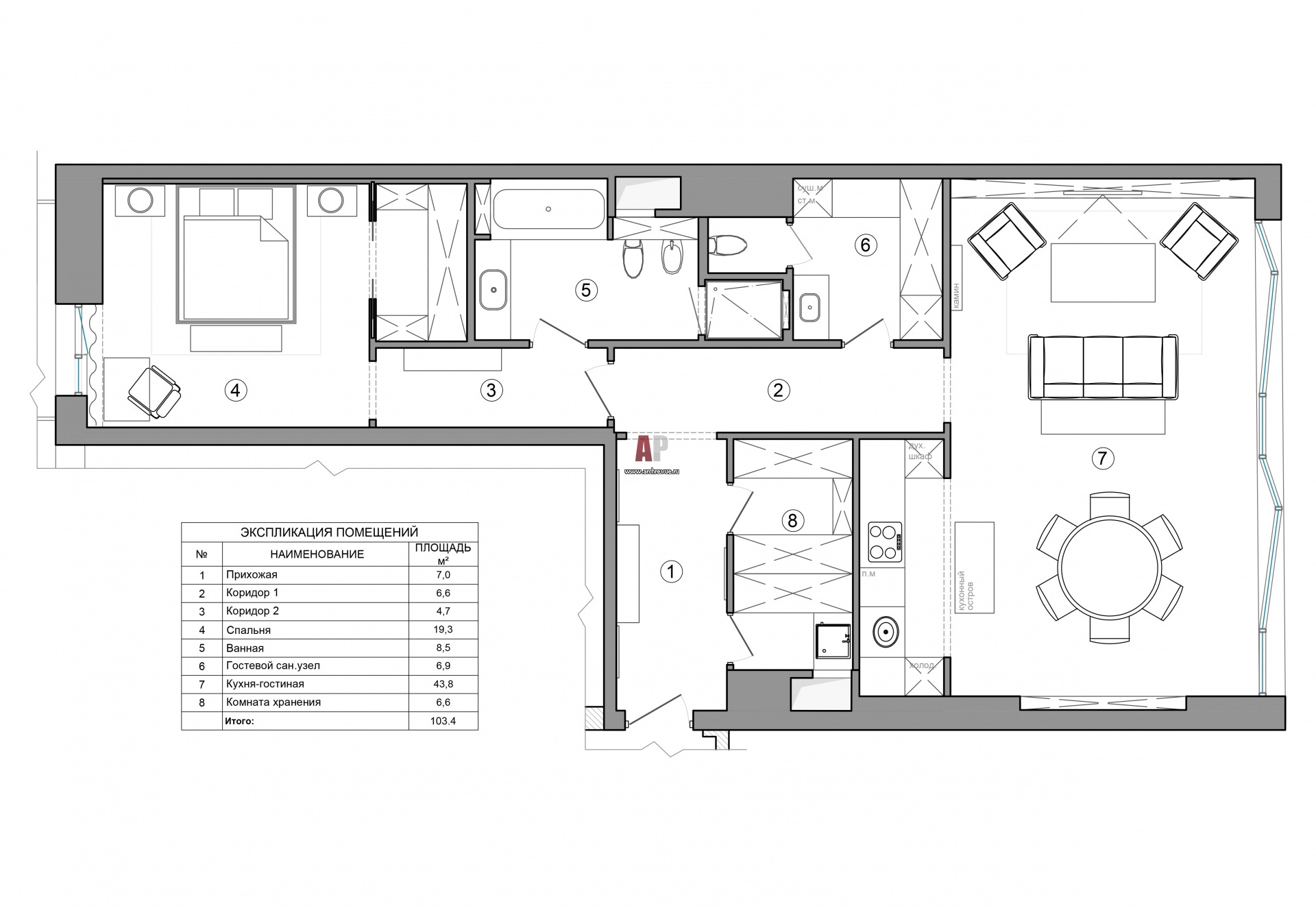 План двухкомнатной квартиры в ЖК «Barkli Park» в Москве. Общая площадь – 110 кв.м.