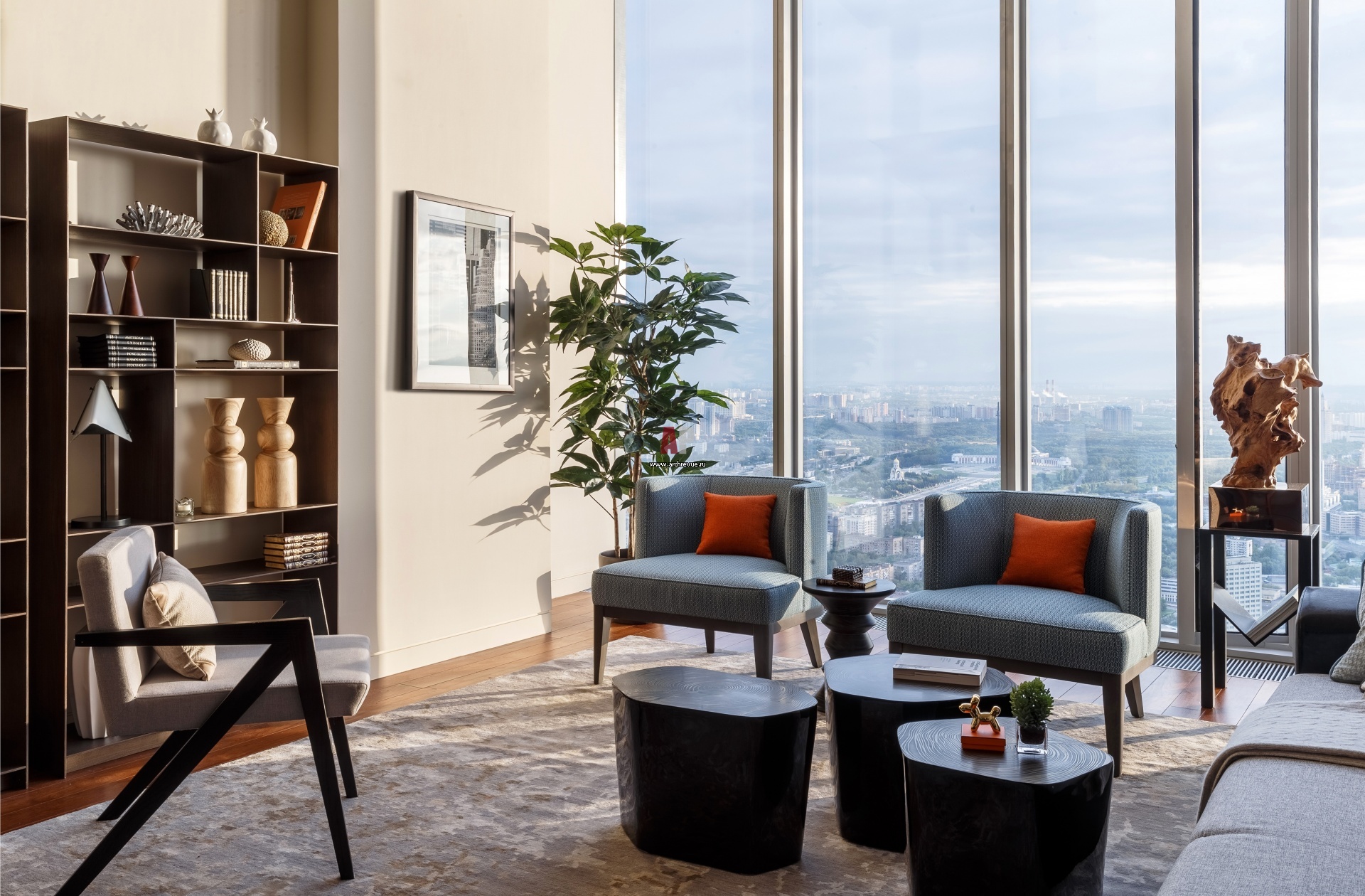 За основу декора панорамной квартиры в башне Москва-Сити взята стилистика актуального ретро.