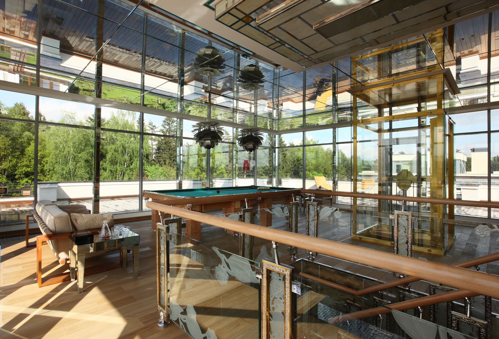 Изначальный вариант проекта предполагал открытую веранду на крыше. Архитекторы сделали поправку на суровый климат России и на большей части этого пространства возвели стеклянный павильон. В получившемся помещении организовали бильярд и домашний бар.