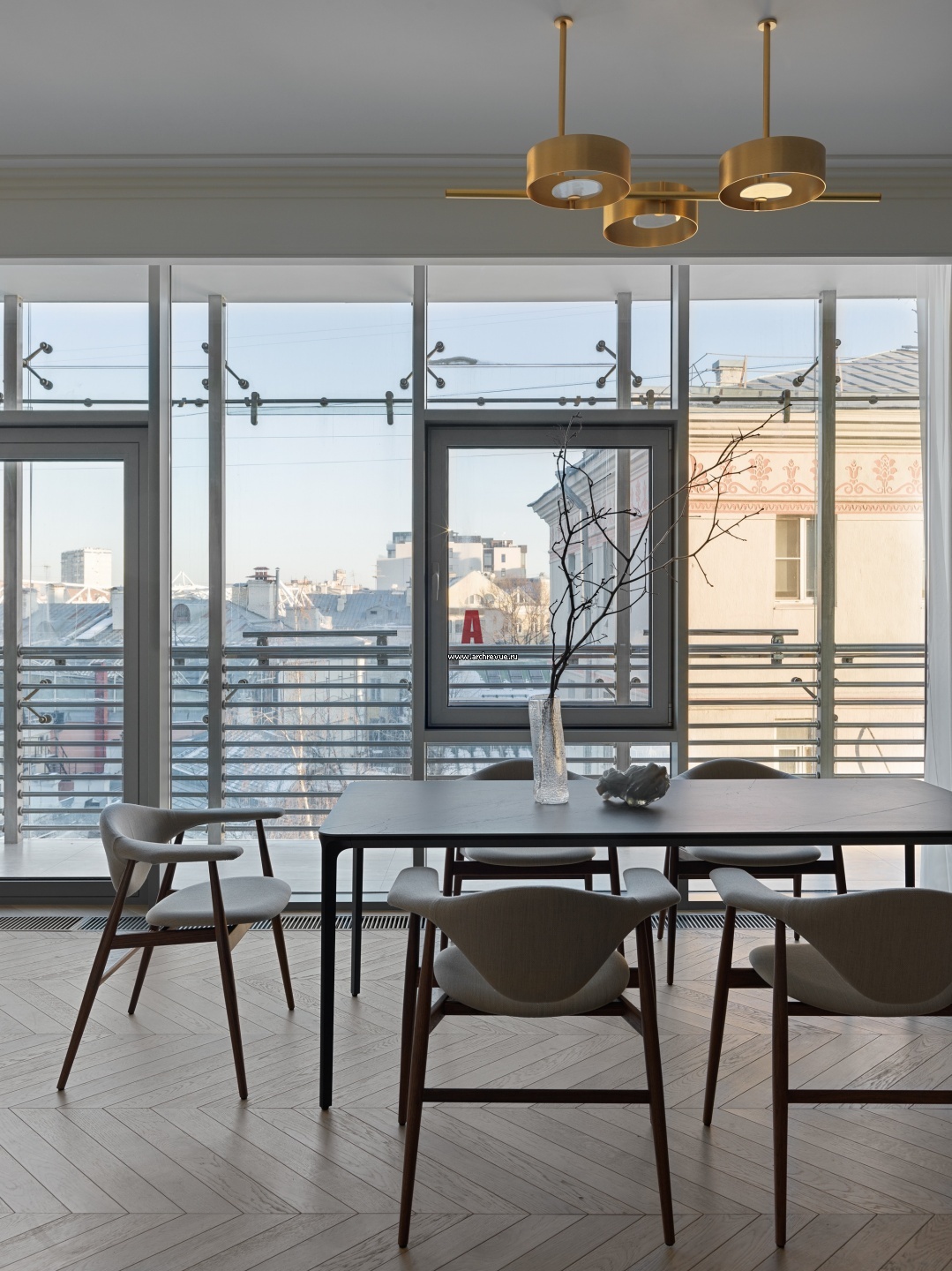 Фрагмент гостиной-столовой. Обеденный стол, Sovet Italia. Стулья, Gubi.