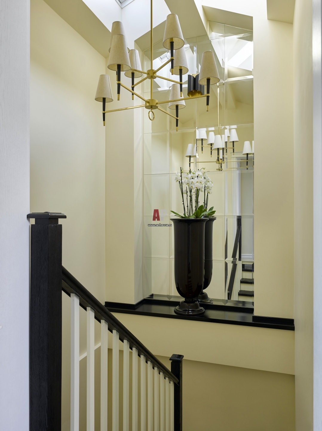 Лестница на второй этаж выглядит лаконично. Она выполнена из темного дерева, балясины выкрашены в белый цвет. Люстра, Robert Abbey по дизайну Jonathan Adler. В зеркальной нише – декоративная напольная ваза, Christopher Guy.