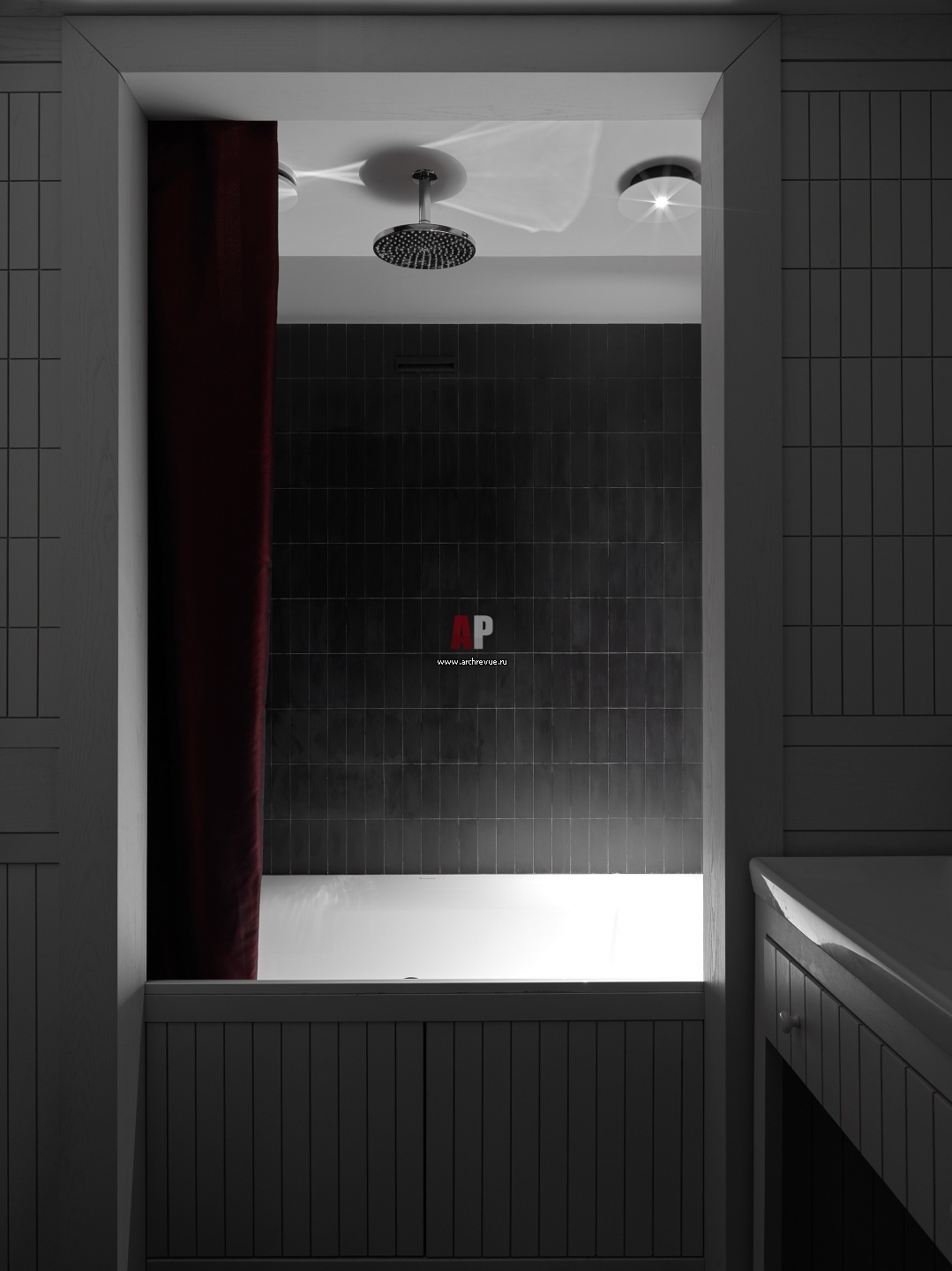 Хозяйская ванная комната. Гафитовая метлахская плитка, душевая портьера винного цвета, камерное освещение создают атмосферу будуара.