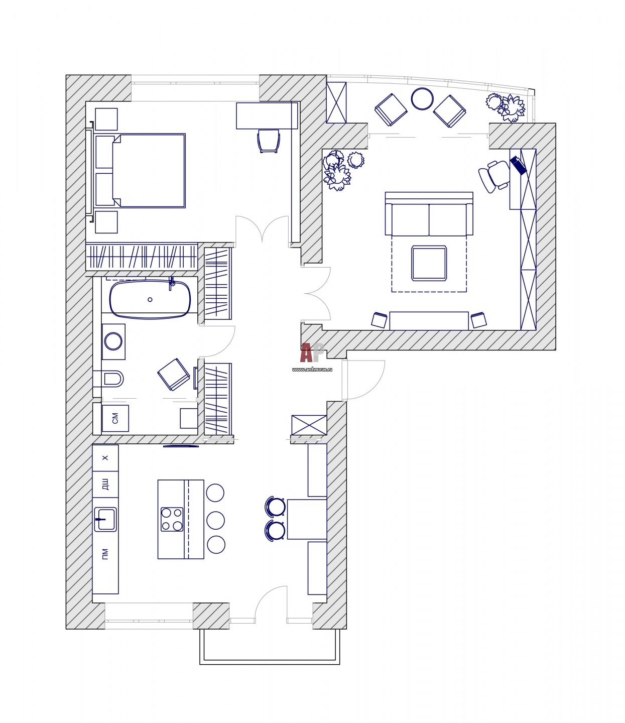 План реконструированной двухкомнатной квартиры в доме советской постройки. Общая площадь – 86 6 кв. м.