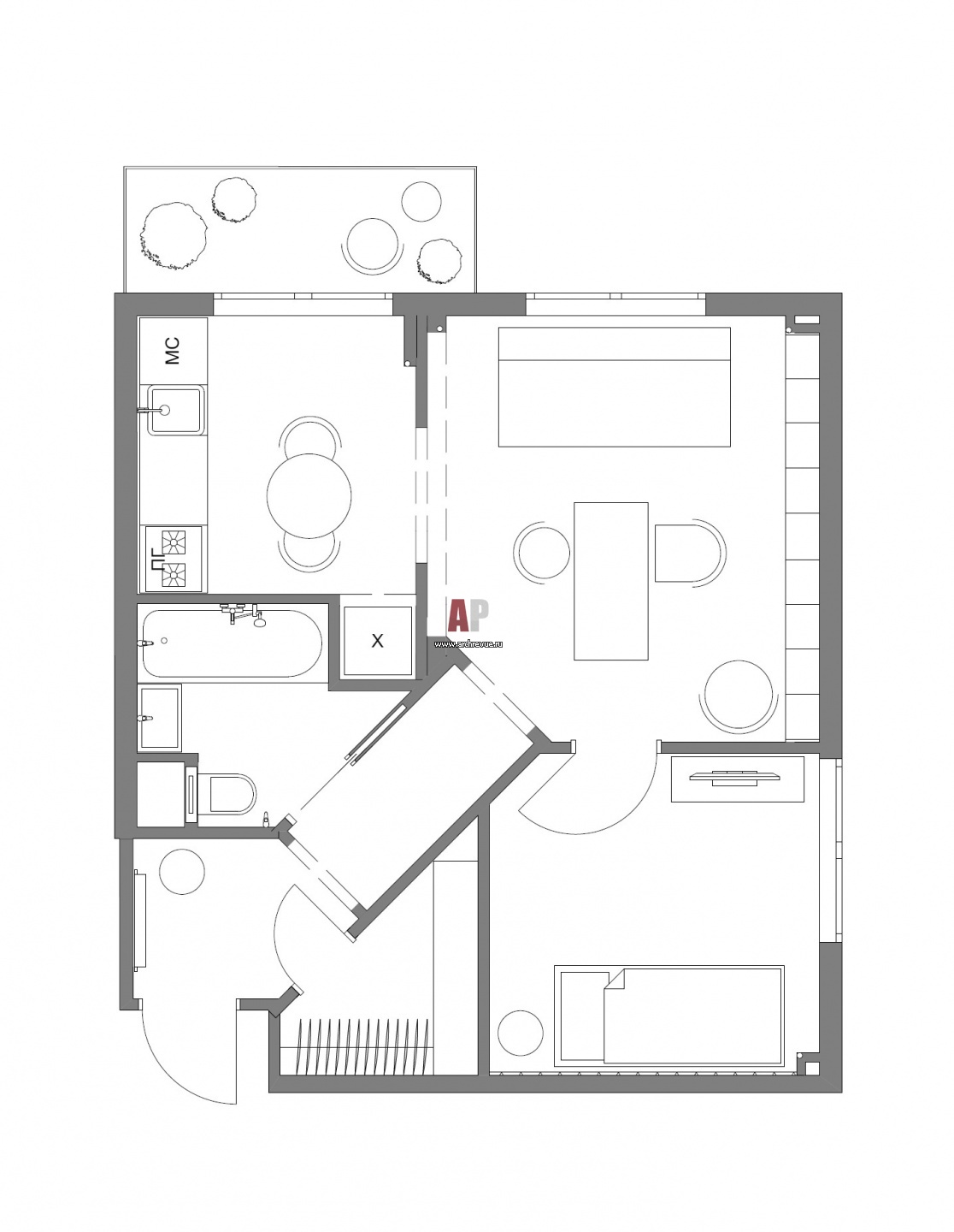 План типовой двухкомнатной квартиры в доме-башне серии И-209 после реконструкции.