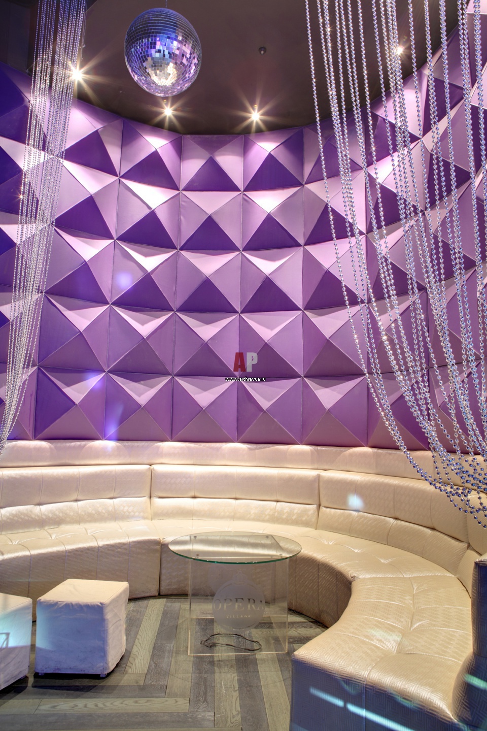 Зона VIP-лаунжа клуба. Полукруглая стена зашита кожаными панелями с пирамидальным объемом.