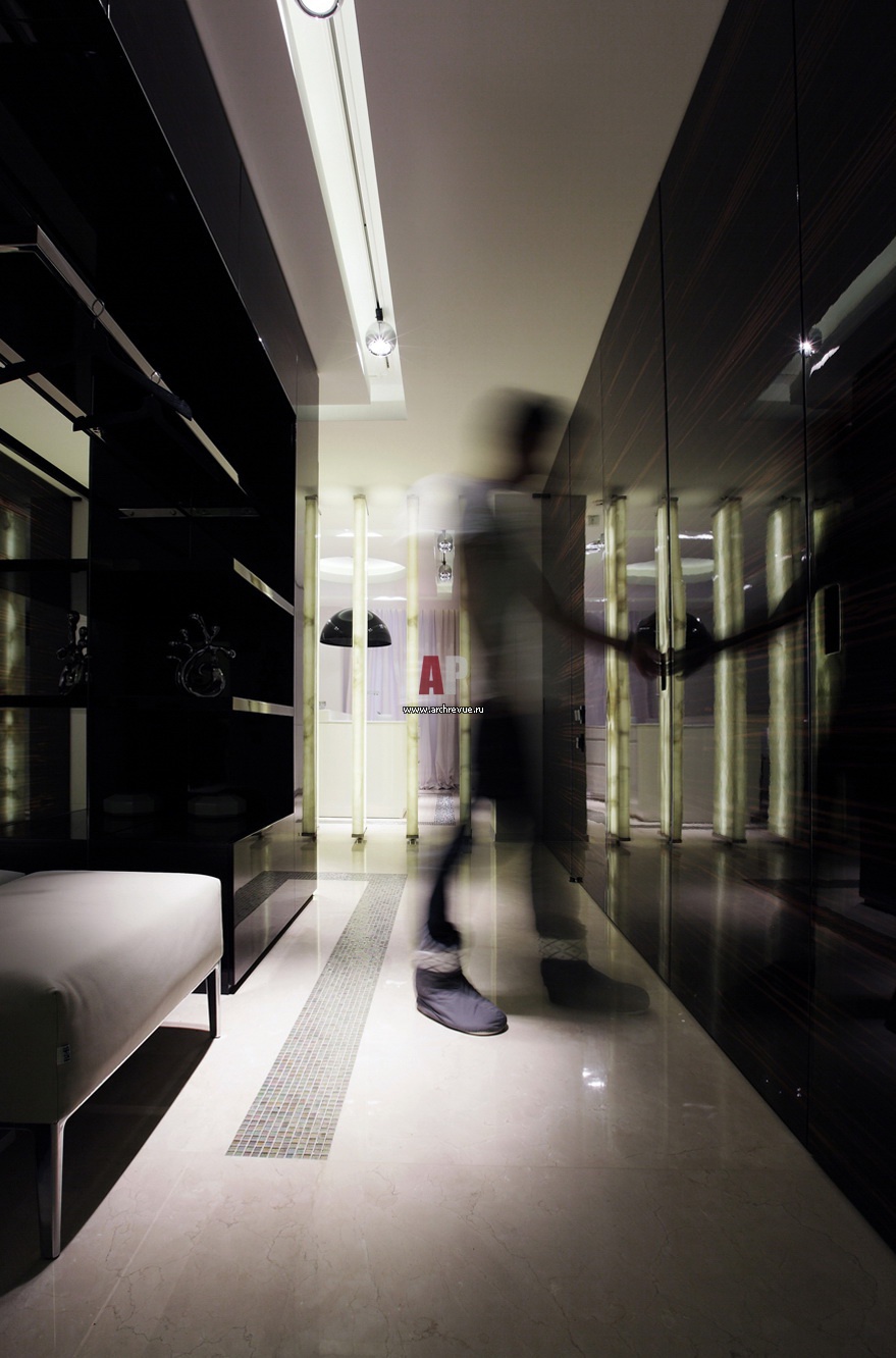 Прихожая. Справа находятся двери в постирочную, гардеробную и ведущий на приватную половину коридор. Они выстроены единым фронтом и воспринимаются как цельное полотно. Двери, простенки, шпон макасара, изготовление «АФ Ника».