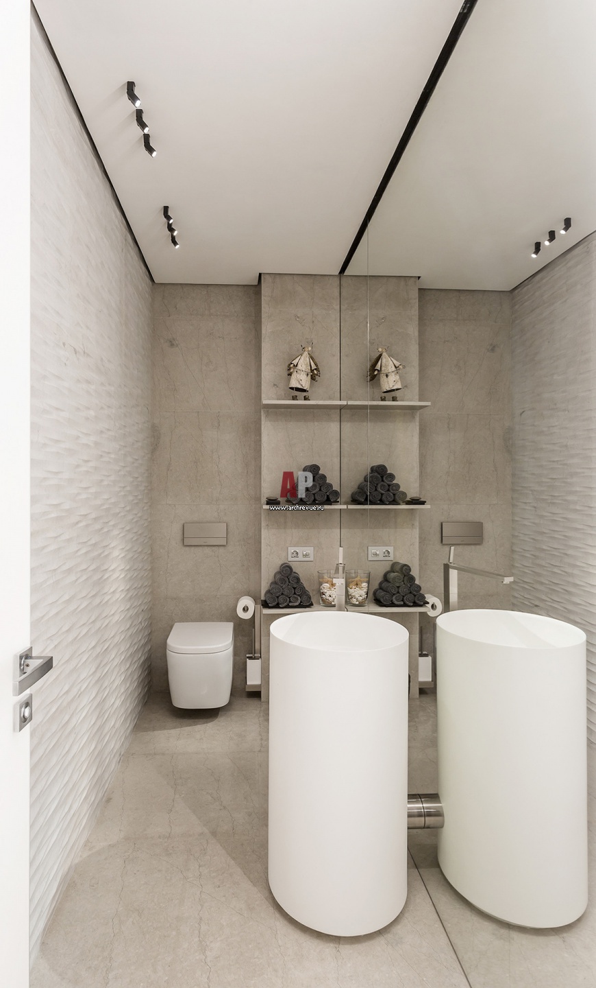 Интерьер санузла в современном стиле с использованием белого мрамора с рельефом.