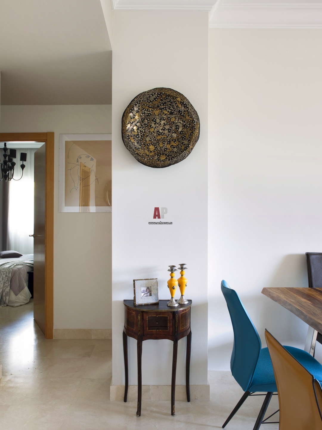 Интерьер гостиной. Антикварные консоли 19 века куплены на местном блошином рынке. Панно ручной работы марокканских умельцев из чеканного металла. Яркие подсвечники и керамика испанских мастеров.