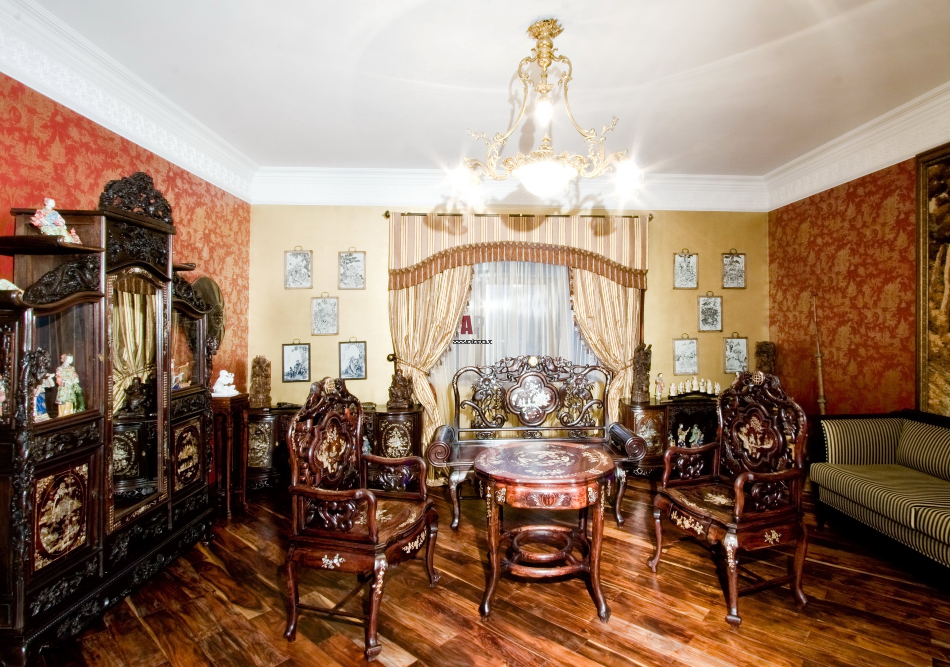 Китайская комната или кабинет-приемная. Резная мебель, статуэтки лошадей и множество других аксессуаров — антикварные, привезены из Китая.