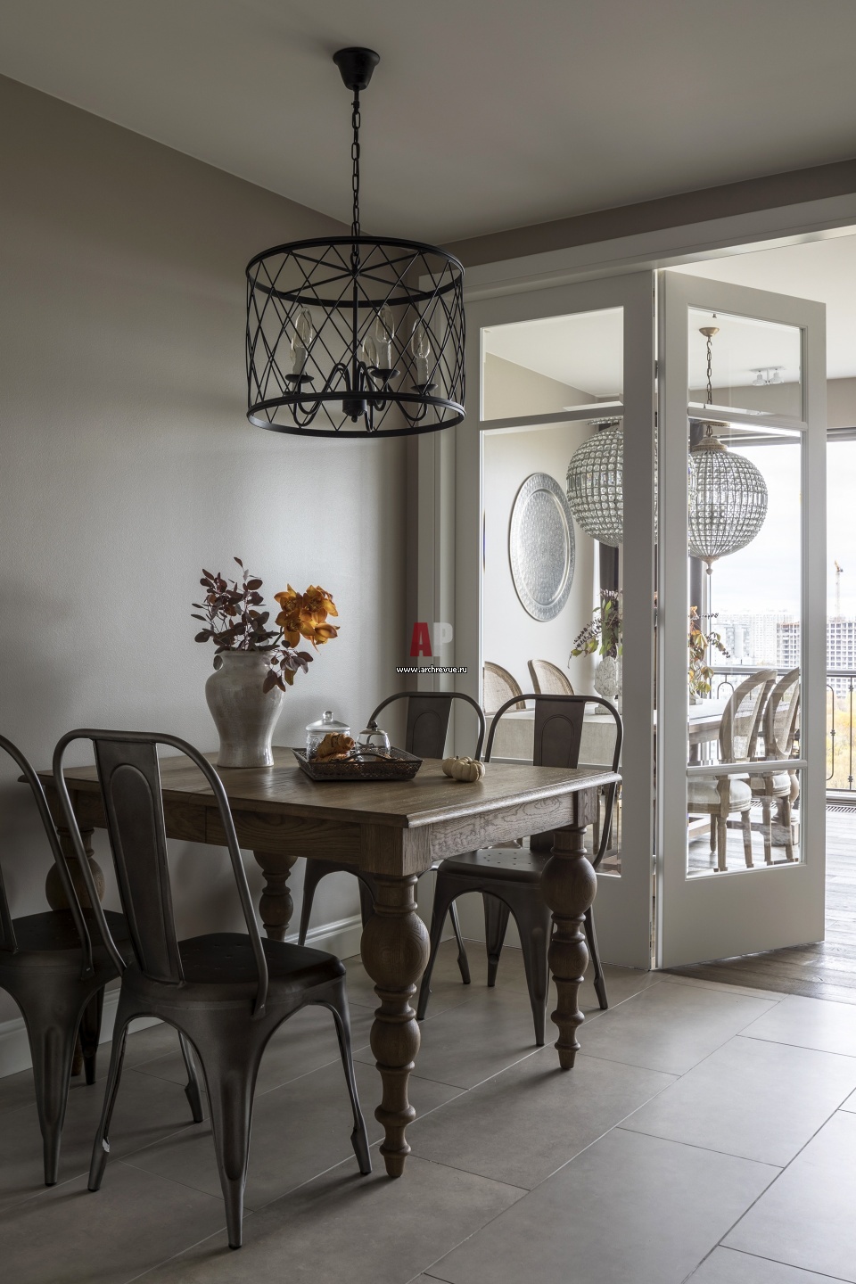 Зона для завтраков на кухне. За ней через открытые стеклянные двери видна парадная столовая. Стол, Restoration Hardware. Стулья, Tolix. Светильник, Pomax. Напольная плитка, Casa Dolce Casa.