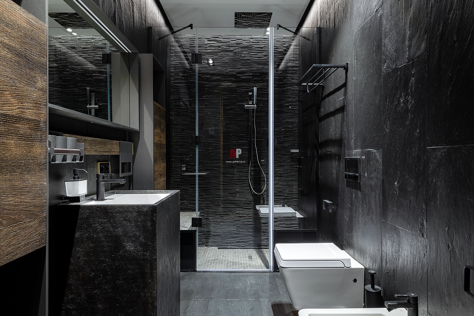 Мужской санузел выглядит брутально за счет отделки стен и пола черным камнем L’Antic Colonial. Душевая выделена каменной мозаикой, умывальник – термодоской. Сантехника, Noken.