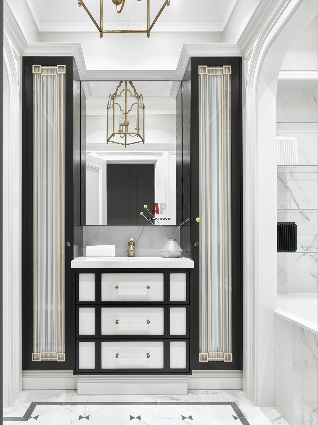 Главная ванная комната отделана холодным бело-серым мрамором. Умывальник с вертикальными витринами в стиле ар-деко сделан из темного дерева на заказ. Сантехника, Villeroy & Boch.