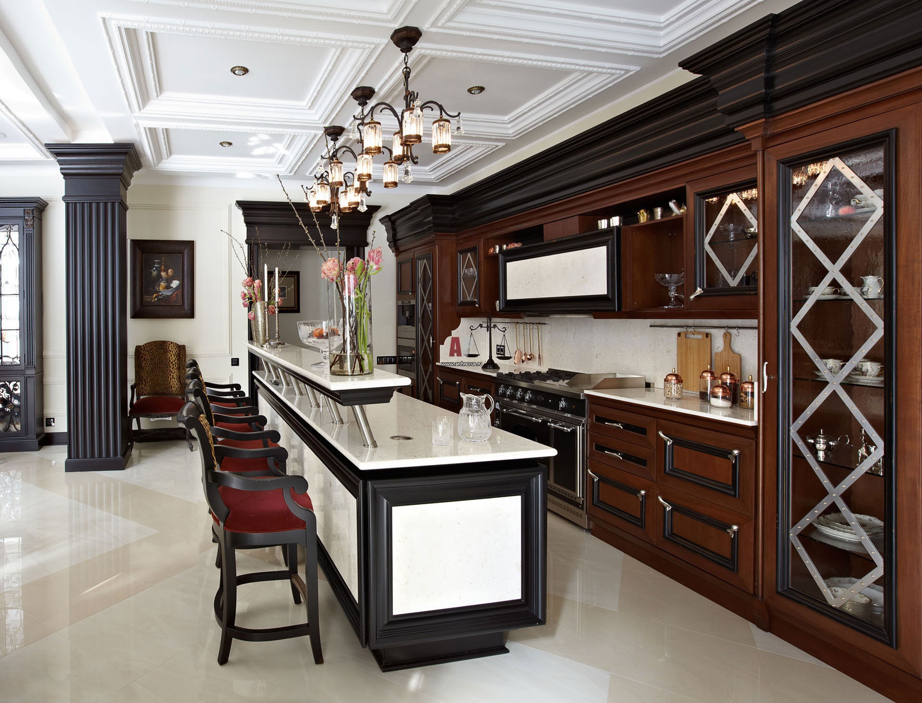 Кухня декорирована лепным кессонированным потолком и колоннами, облицованными тонированным деревом, изготовитель «Диапазон Инвест». Барная стойка решена как длиння витрина и облицована натуральным камнем. Кухня фабрики Brummel.