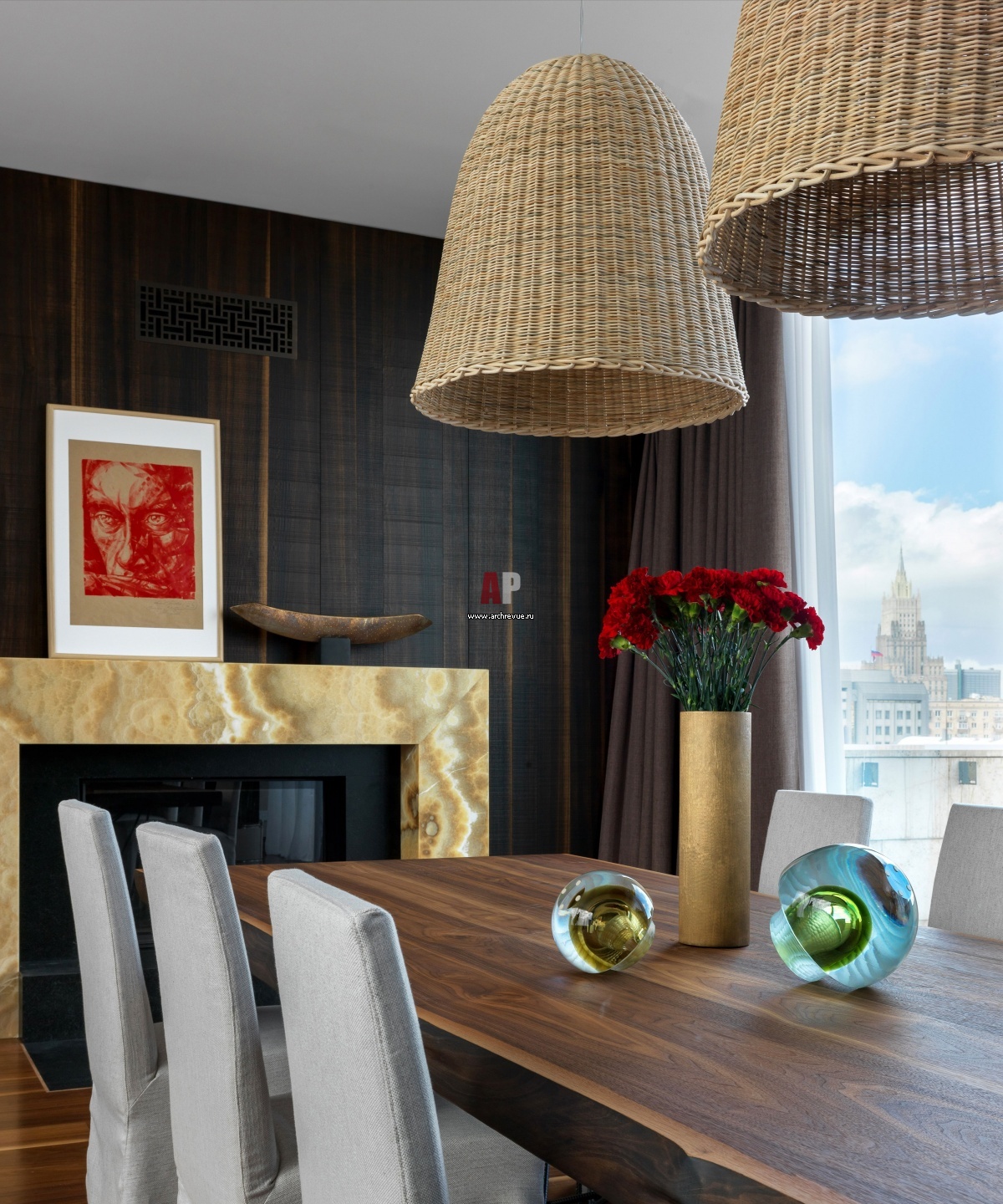 В столовой оборудован дровяной камин. Его портал выполнен из оникса. На стене – картина «Путь», художник Алексей Беляев-Гентовт.