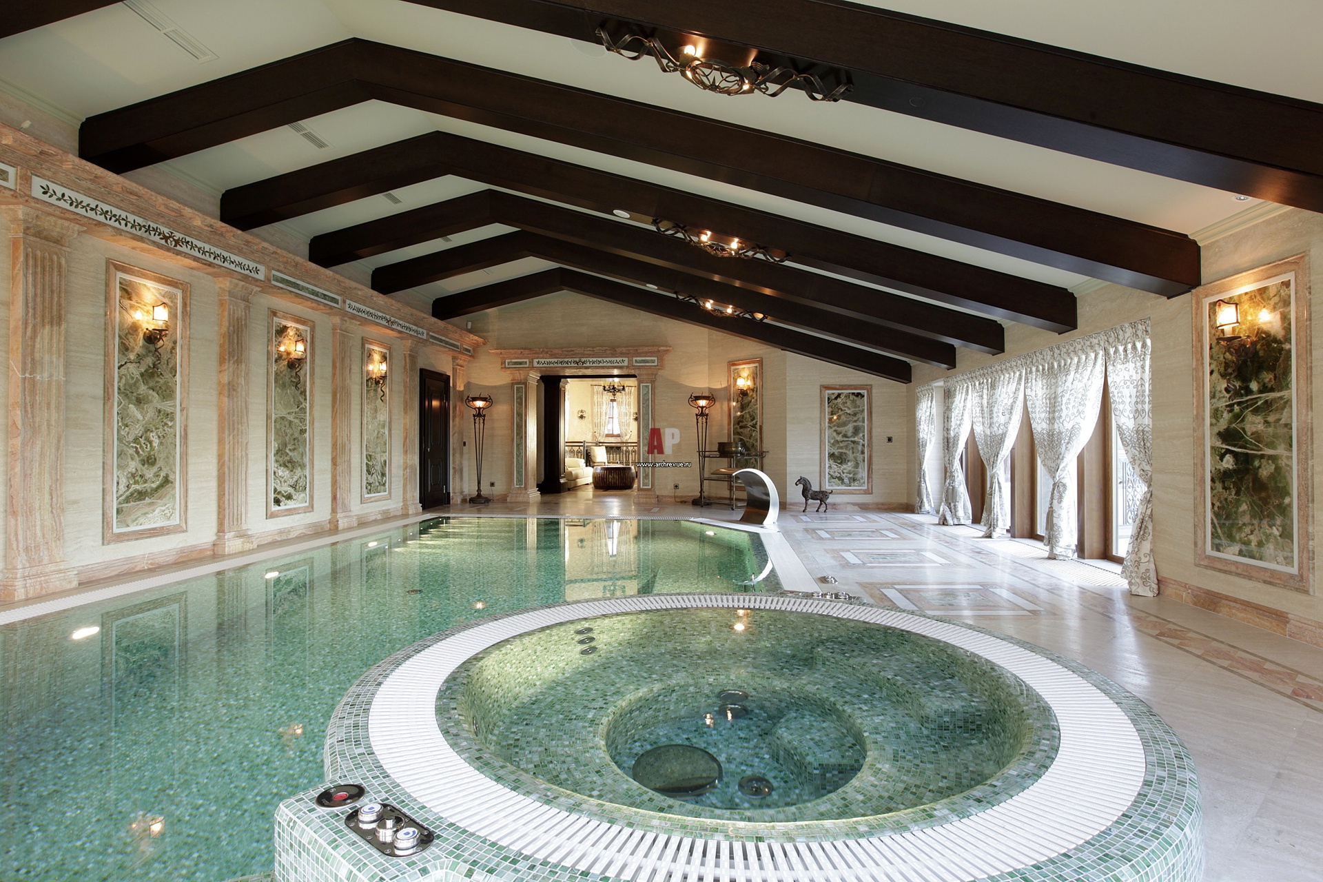 Фото интерьера бассейна с гидромассажной купелью в доме. Чаша бассейна выложена светло-бирюзовой мозаикой.