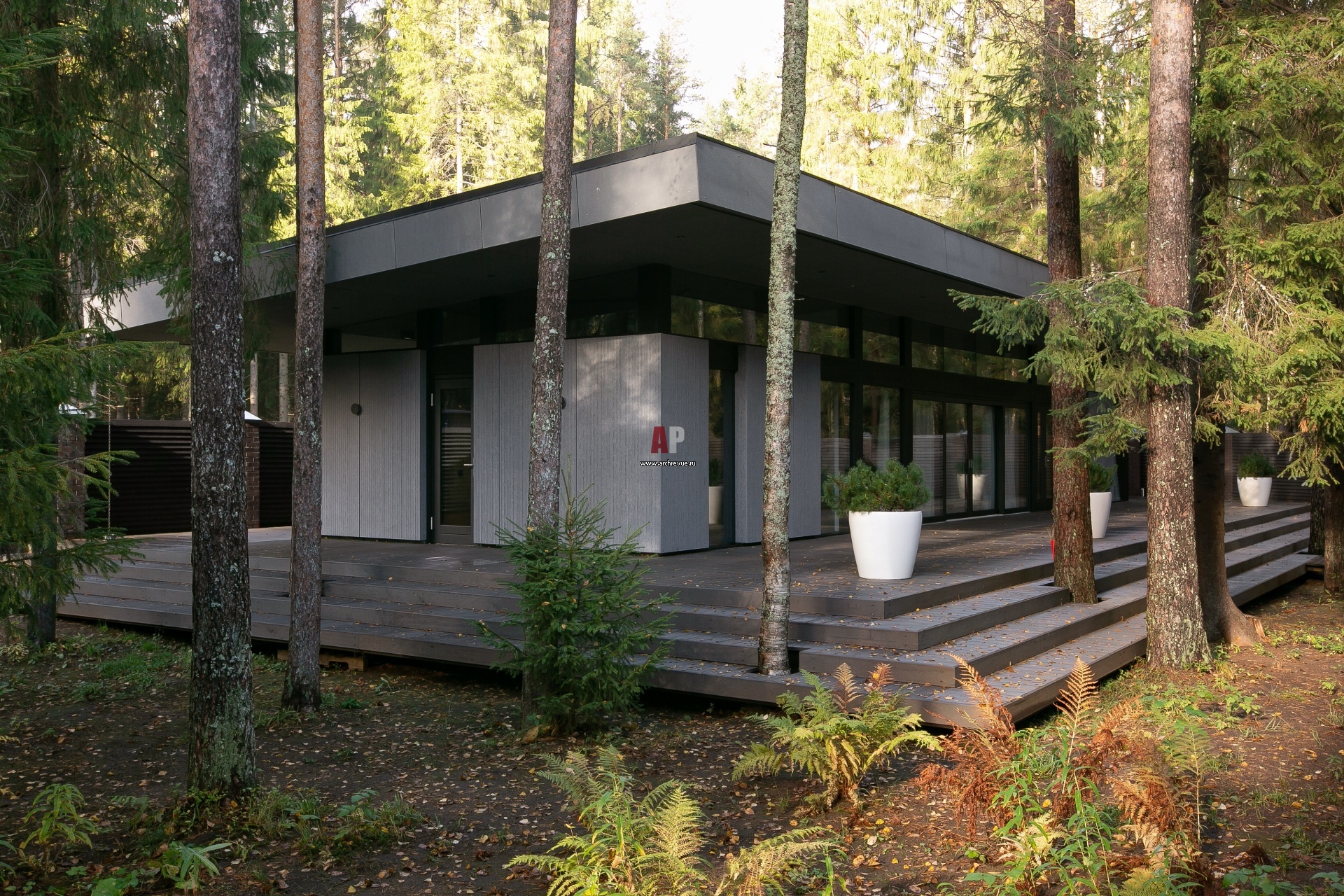 Кровля и фасад дома облицованы фиброцементными панелями Equitone, имитирующими текстуру камня. Ленточное остекление не имеет рам, и за счет этого приема массивная кровля, потолок и свесы дома соединяются в единую плоскость и словно парят в воздухе.