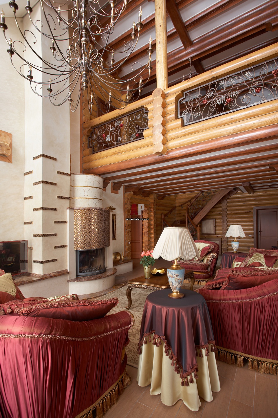 Фото интерьера зоны камина в двусветном пространстве гостиной. Полукруглый фасад камина оформлен золотой и бронзовой мозаикой. Топка кассетного типа Axis, дымоходная система из керамики Schiedel. Ограждение лестницы и балкона второго этажа – кованое с природными мотивами – гроздьями рябины.