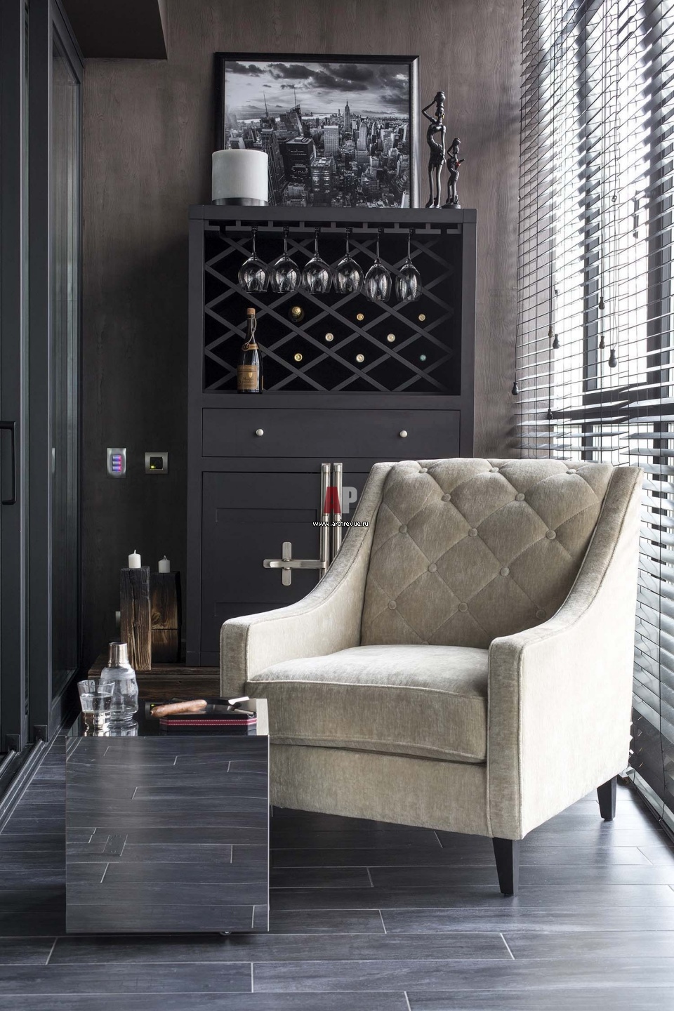 На балконе при спальне оборудована сигарная. На полу – серый керамогранит, Settecento. Винный стеллаж изготовлен на заказ на фабрике Guadarte. Столик приставной зеркальный, Cattelan Italia. Кресло, La Fibule.