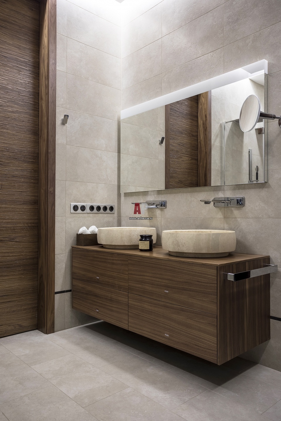 Интересным решением стала проходная ванная комната, попасть в которую можно как из родительской спальни, так и из детской. Приватность обеспечивается электрозамками, при нажатии кнопки на входе блокируются обе двери одновременно. Керамогранит, Caesar, поставщик BARS RED.