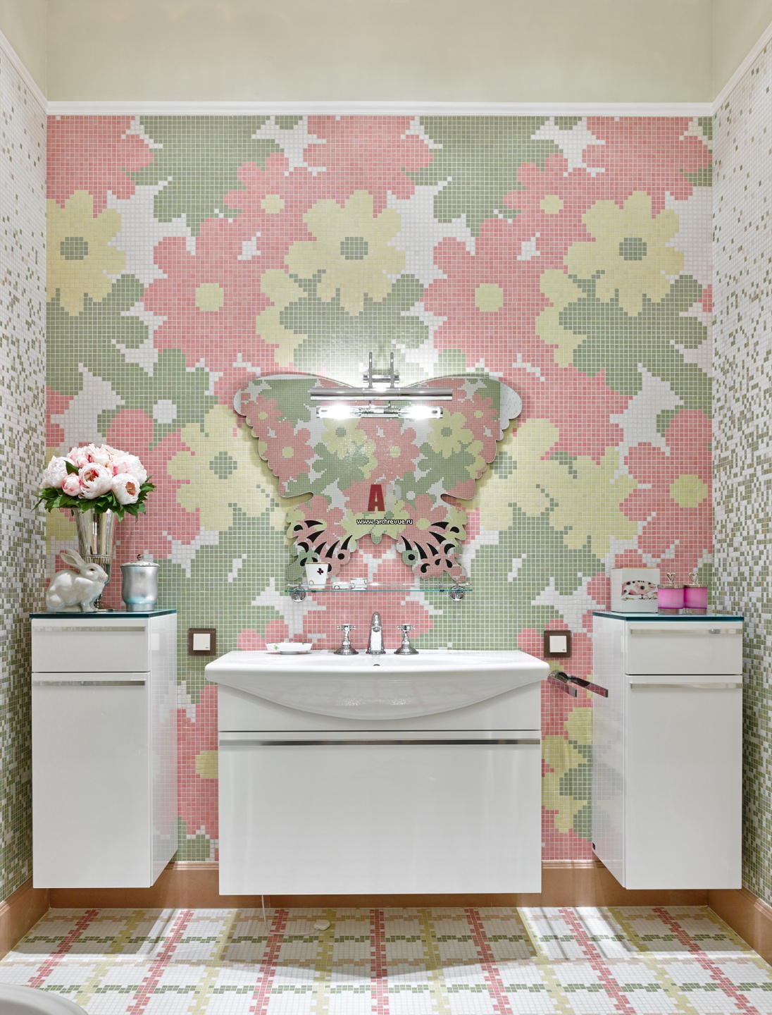 Интерьер ванной комнаты с мозаичным декором. Стена за умывальником оформлена панно из мозаики с цветами, на нем практически растворяется зеркало в форме бабочки. Сантехника, Villeroy & Boch.