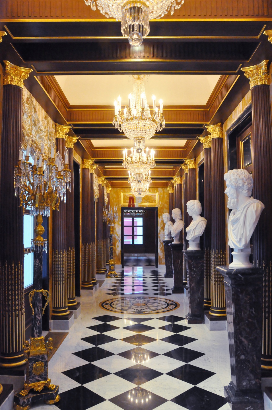 Входная группа акцентирована парадной колоннадой. Колонны оформлены деревом с резьбой и золочением. Ритм подчеркивают беломраморные бюсты на гранитных постаментах. Раскладка пола – черно-белые ромбы – выполнена в духе французских замковых интерьеров времен Наполеона Бонапарта.