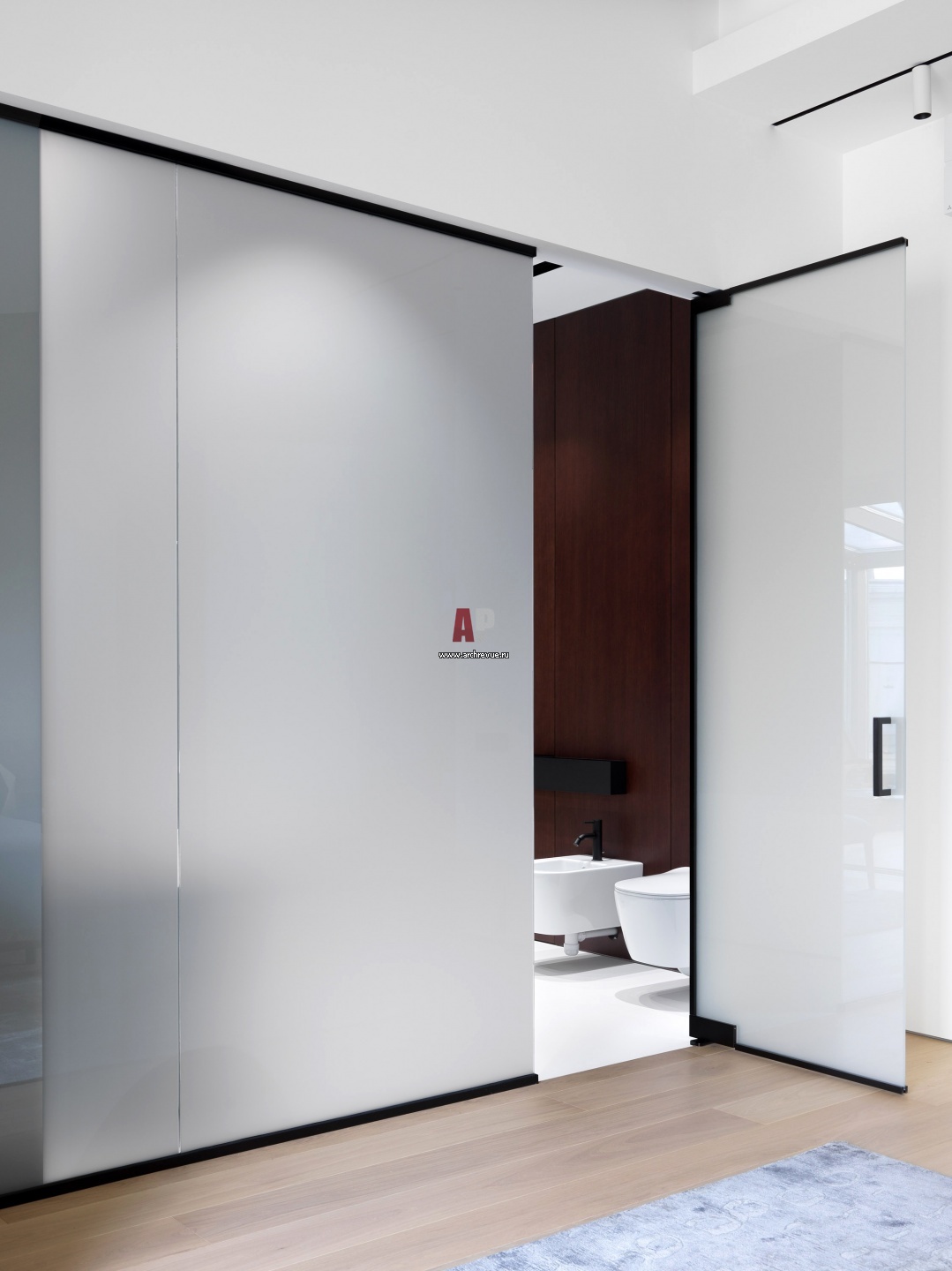 Между спальней и ванной комнатой установлена перегородка из смарт-стекла. При выключенном свете стекло прозрачное (и хорошо видно красивую ванную), при включенном –стекло матируется от пульта и обеспечивает приватность.