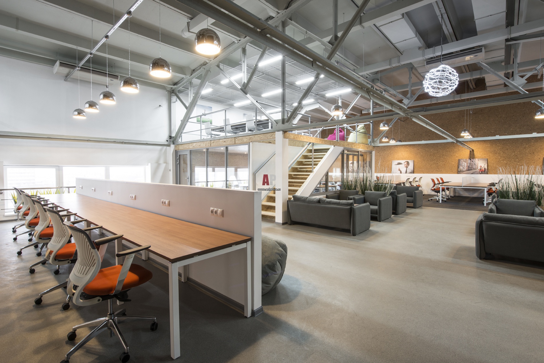 Вид со стороны рабочей зоны нижнего уровня на лестницу и антресоль второго этажа. Четыре надстроенных антресоли предназначены преимущественно для работы стартап-комнад.