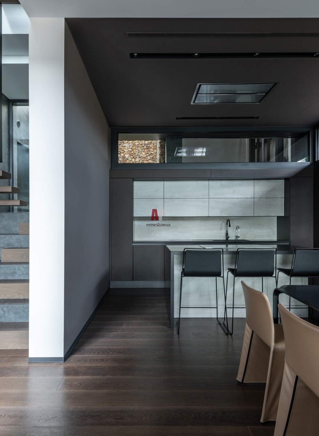 Современная 3-х этажная вилла с бассейном на побережье Испании. Интерьер кухни. Фасады кухни выполнены из телячьей кожи в оттенке taupe и дополнены светлым травертином на фартуке и острове.