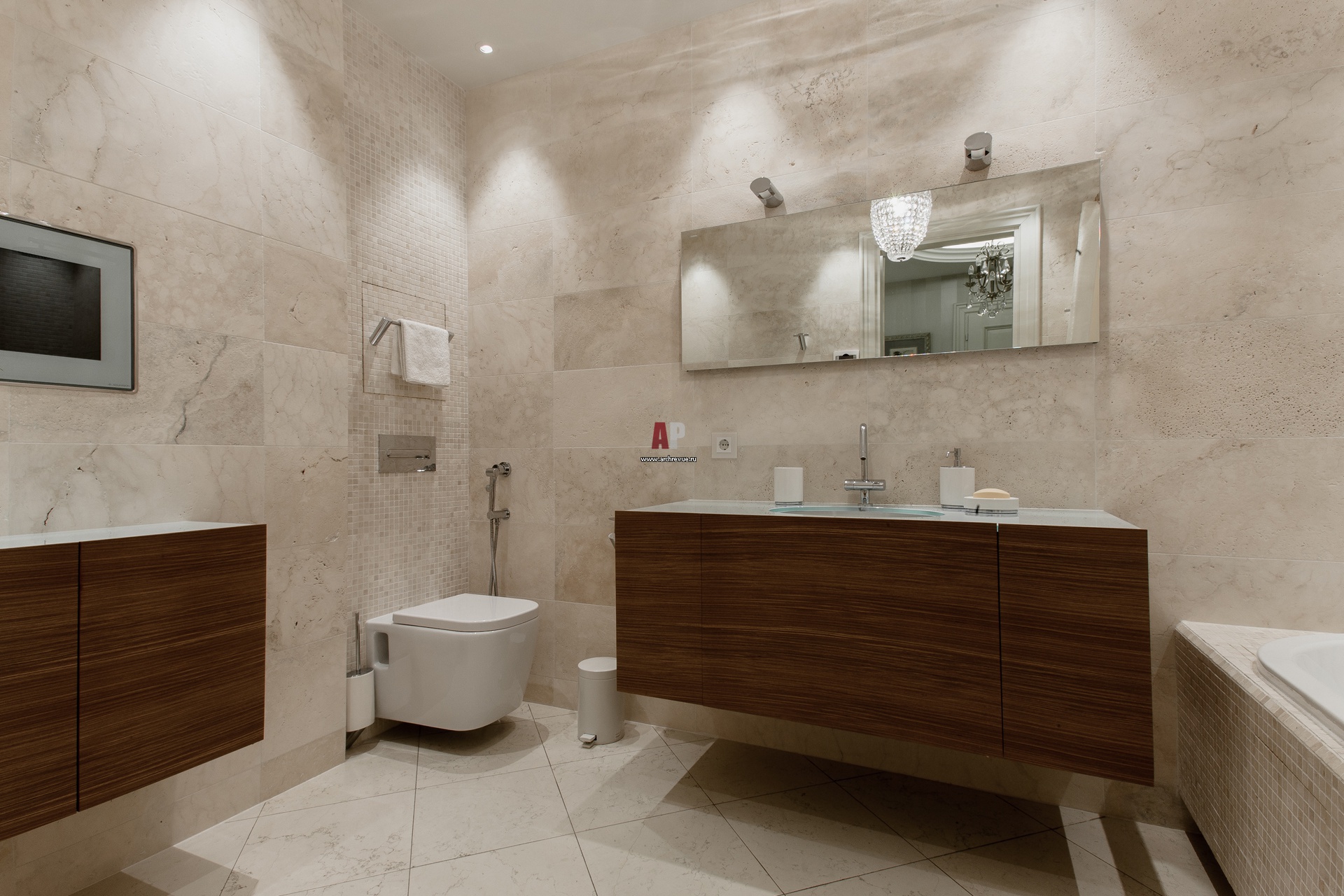 Хозяйский санузел. Пол, стены, облицовка травертином с пористой фактурой. Отделка мебели полированными панелями из ореха.
