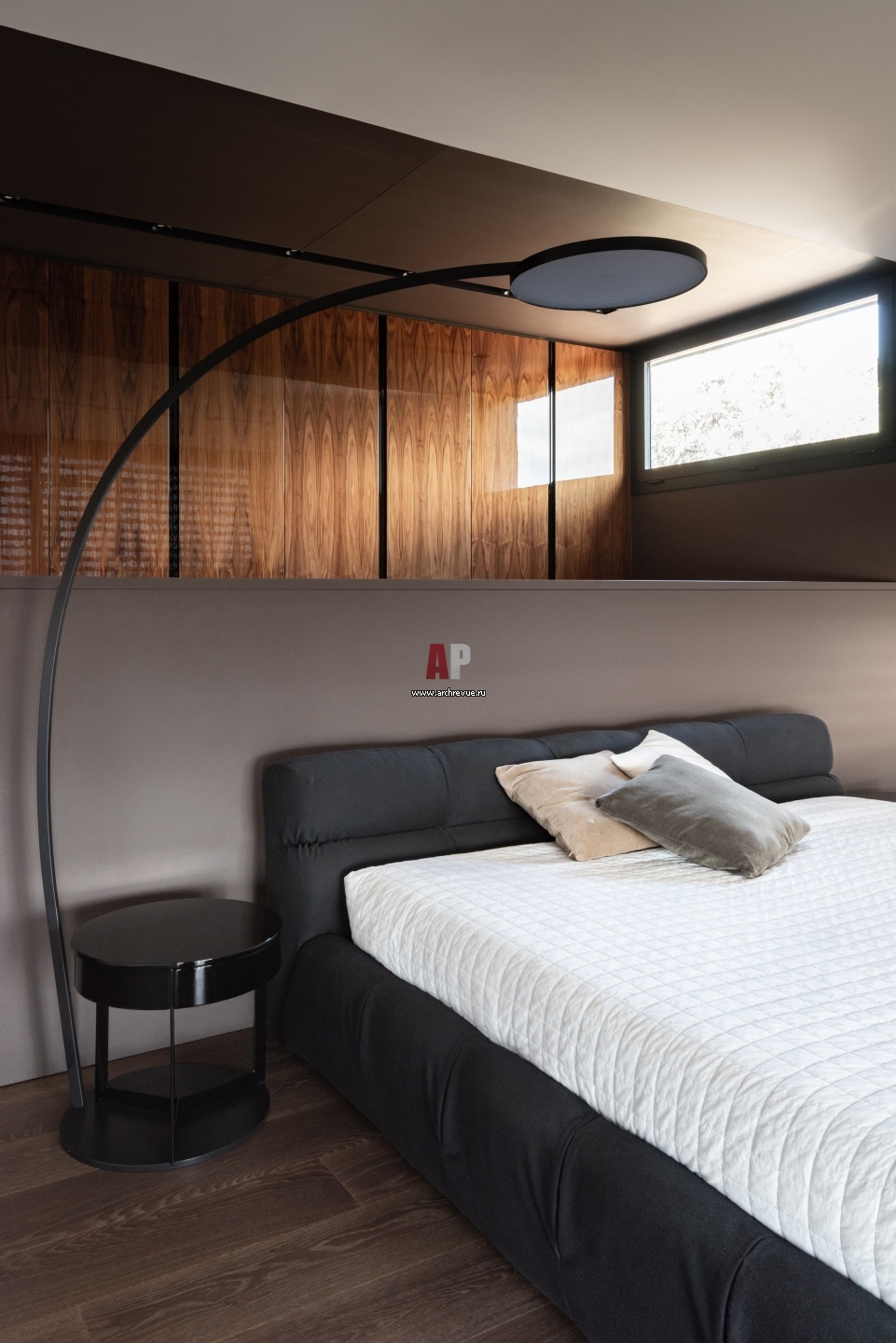 Мастер-спальня. От зоны сна гардеробная из шпона ореха отделена стеклянной перегородкой.