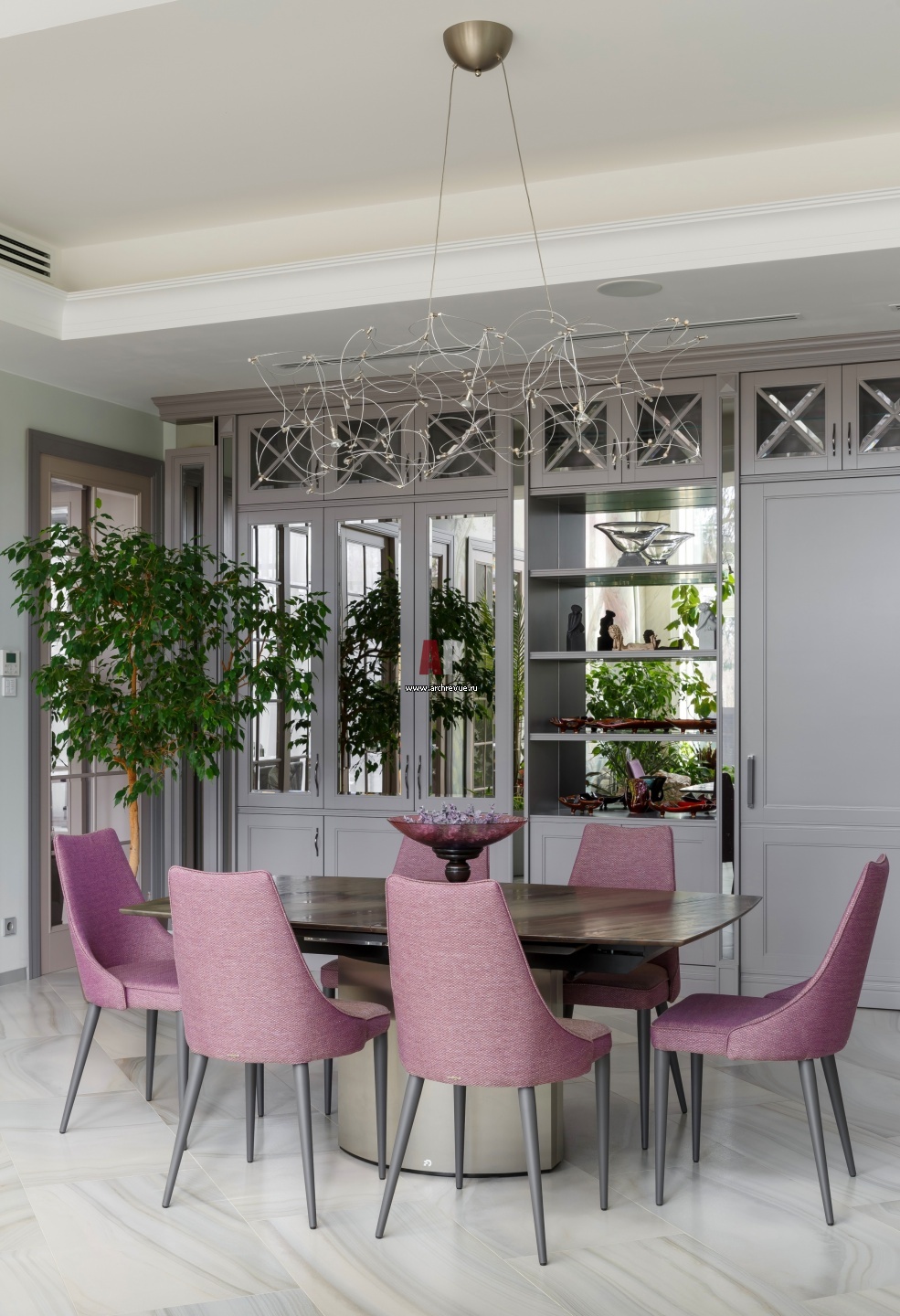 Отправной точкой интерьера первого этажа стал обеденный стол Draenert. Его столешница выполнена из натурального серого матового мрамора, который потом «повторили» в оформлении камина, лестницы и зимнего сада.